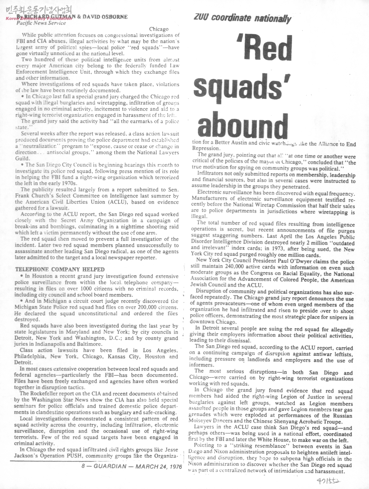 - 지역 경찰대(Local Police)인 Red squads의 불법행위(무단침입, 불법도청 등)에 관한 기사.