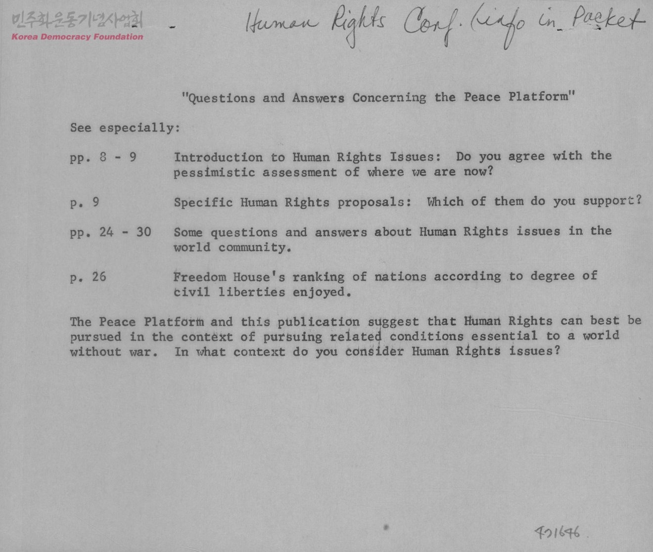 - "Questions and Answers Concerning the Peace Platform" ORGANIZATIONS Background Bibliography on Human Rights INTERNATIONAL HUMAN RIGHTS: FOUR QUESTIONS(Robert Woito).