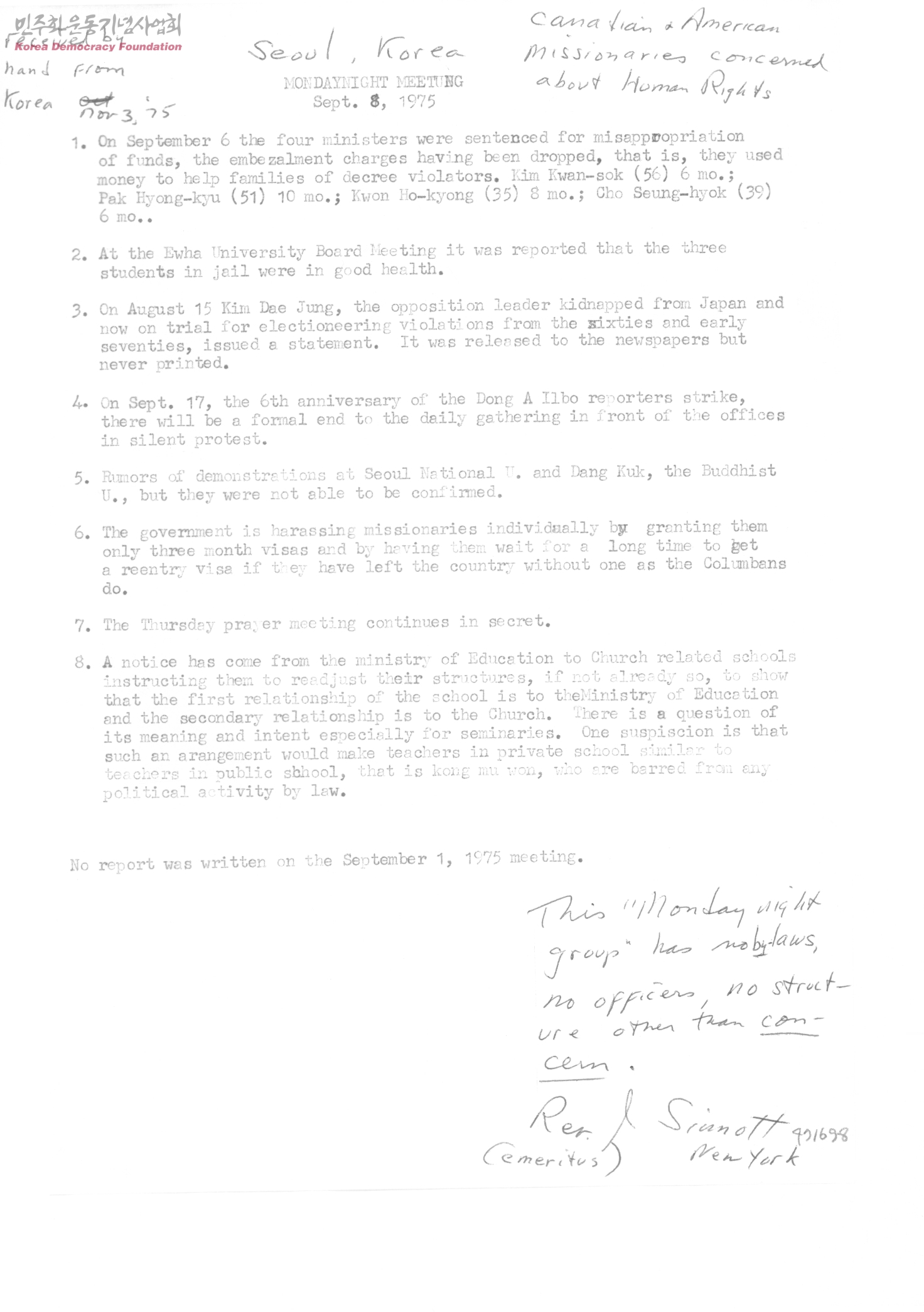 - Monday Night Group 회의록(1975.9.15), 문서 하단에 제임스 시노트 신부님의 메모 있음.