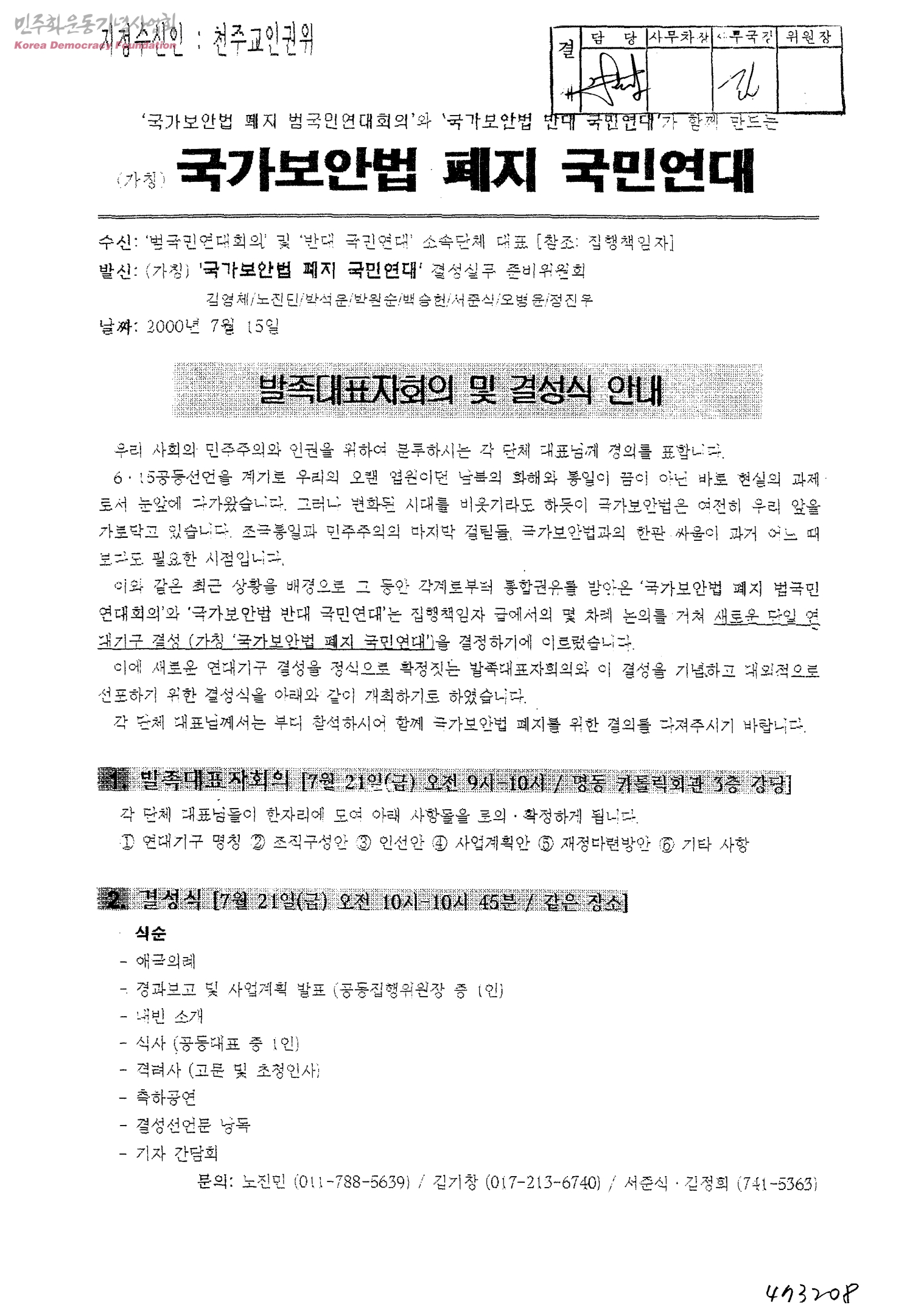 발족대표자회의 및 결성식 안내[수신:'범국민연대회의' 및 '반대 국민연대' 소속단체 대표, 발신:(가칭)'국가보안법 폐지 국민연대' 결성실무 준비위원회]