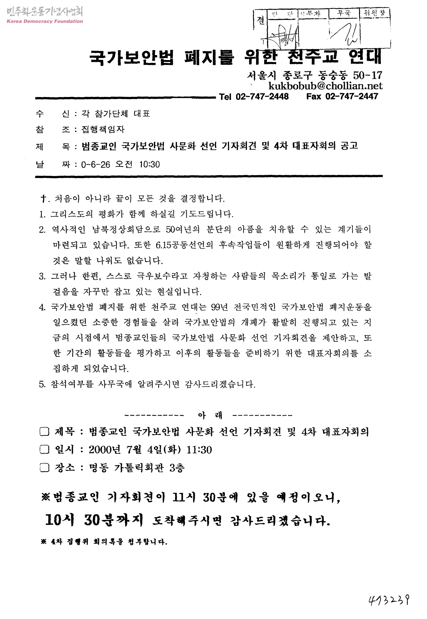 범종교인 국가보안법 사문화 선언 기자회견 및 4차 대표자회의 공고[수신:각 참가단체 대표]