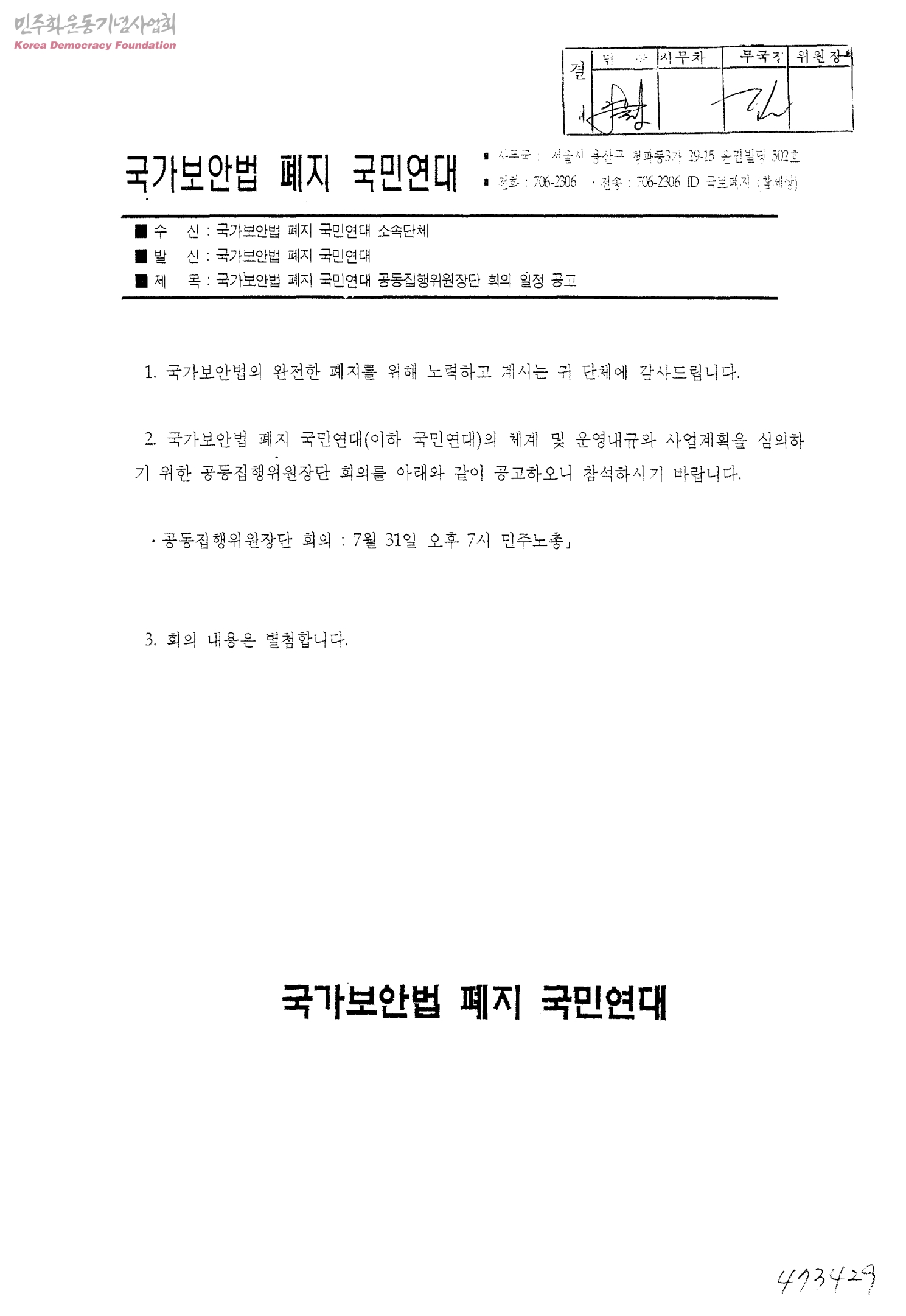 국가보안법 폐지 국민연대 공동집행위원장단 회의 일정 공고[수신:국가보안법 폐지 국민연대 소속단체, 발신:국가보안법 폐지 국민연대]