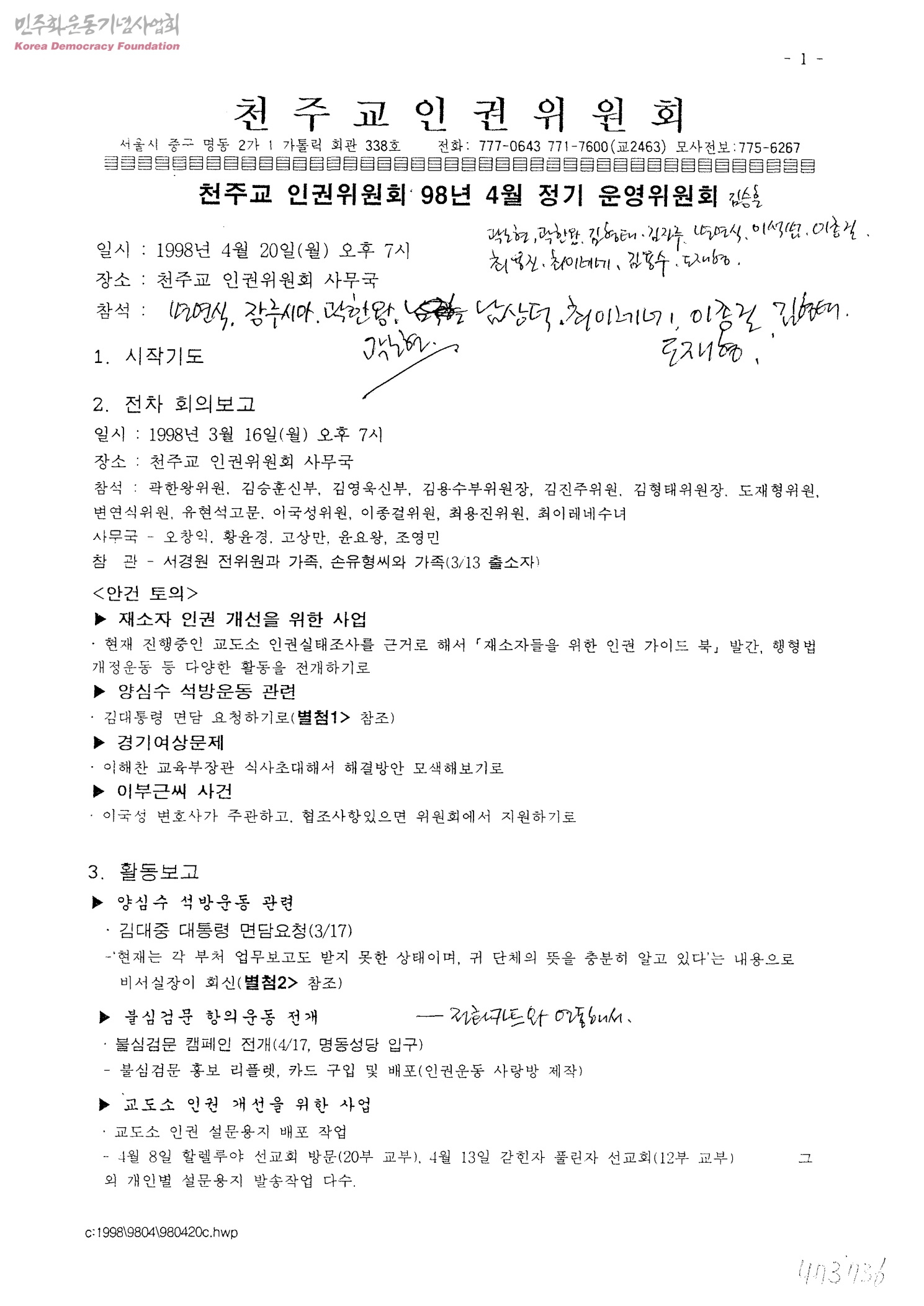 천주교 인권위원회 98년 4월 정기 운영위원회
