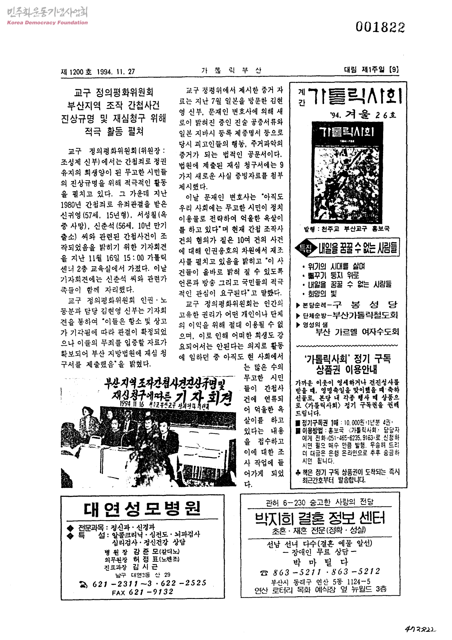 교구 정의평화위원회 부산지역 조작 간첩사건 진상규명 및 재심청구 위해 적극 활동 펼쳐