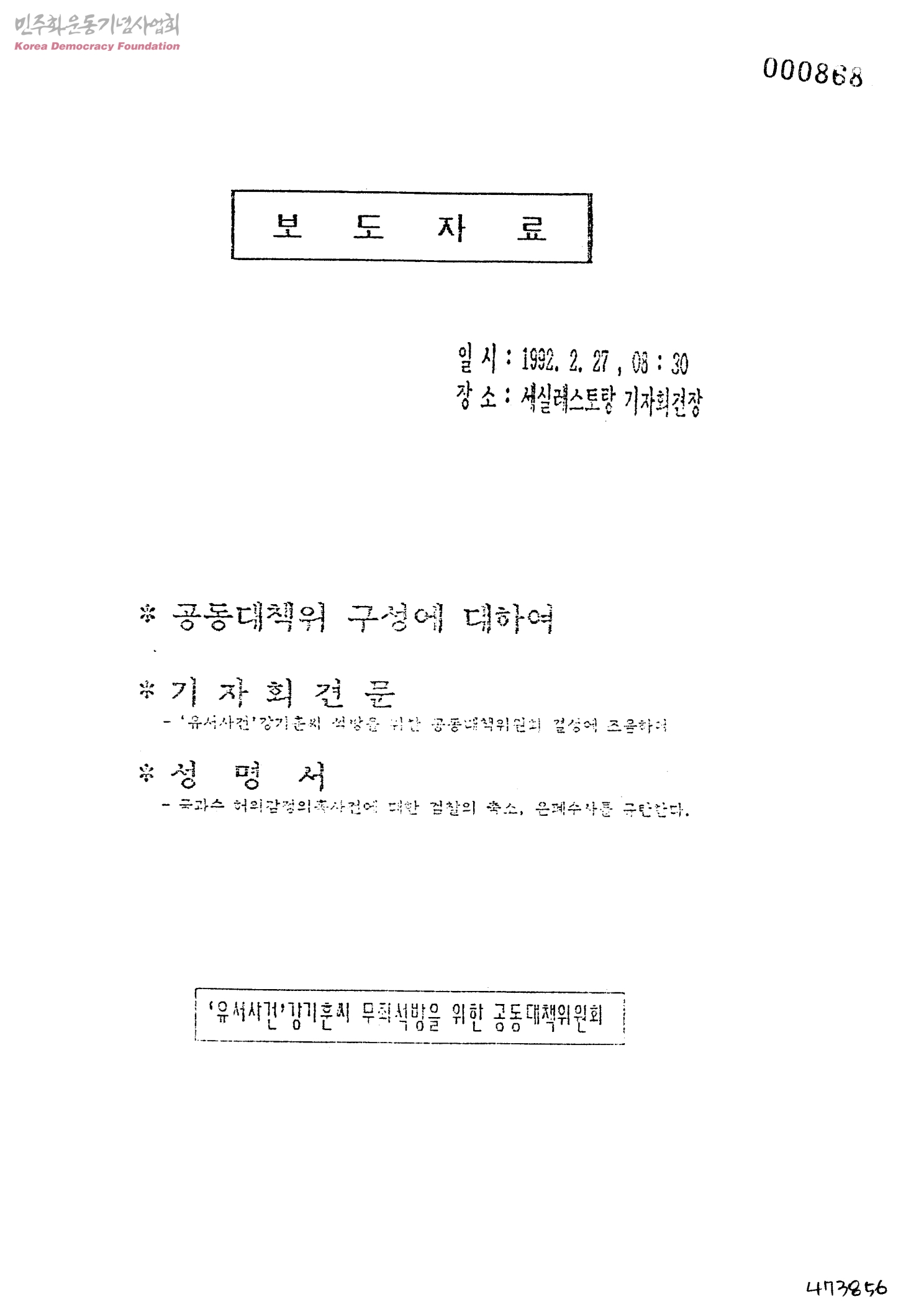 - 공동대책위 구성에 대하여 기자회견문-'유서사건'강기훈씨 석방을 위한 공동대책위원회 결성에 즈음하여 성명서-국과수 허위감정의혹사건에 대한 검찰의 축소, 은폐수사를 규탄한다.