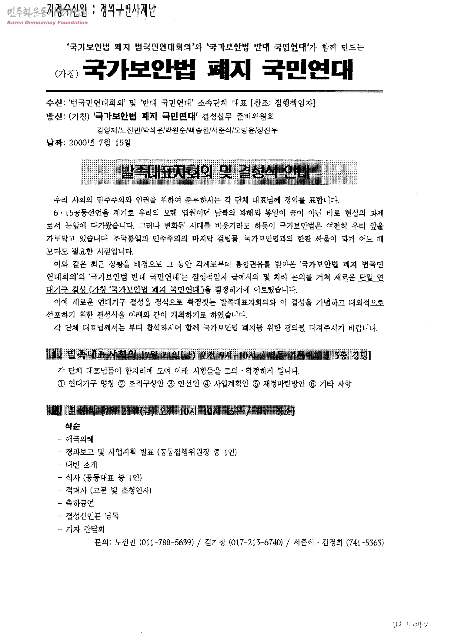 발족대표자회의 및 결성식 안내[수신:'범국민연대회의' 및 '반대 국민연대'소속단체 대표, 발신:(가칭)'국가보안법 폐지 국민연대'결성실무 준비위원회 김영제/노진민/박석운/박원순/백승헌/서준식/오병윤/정진우]