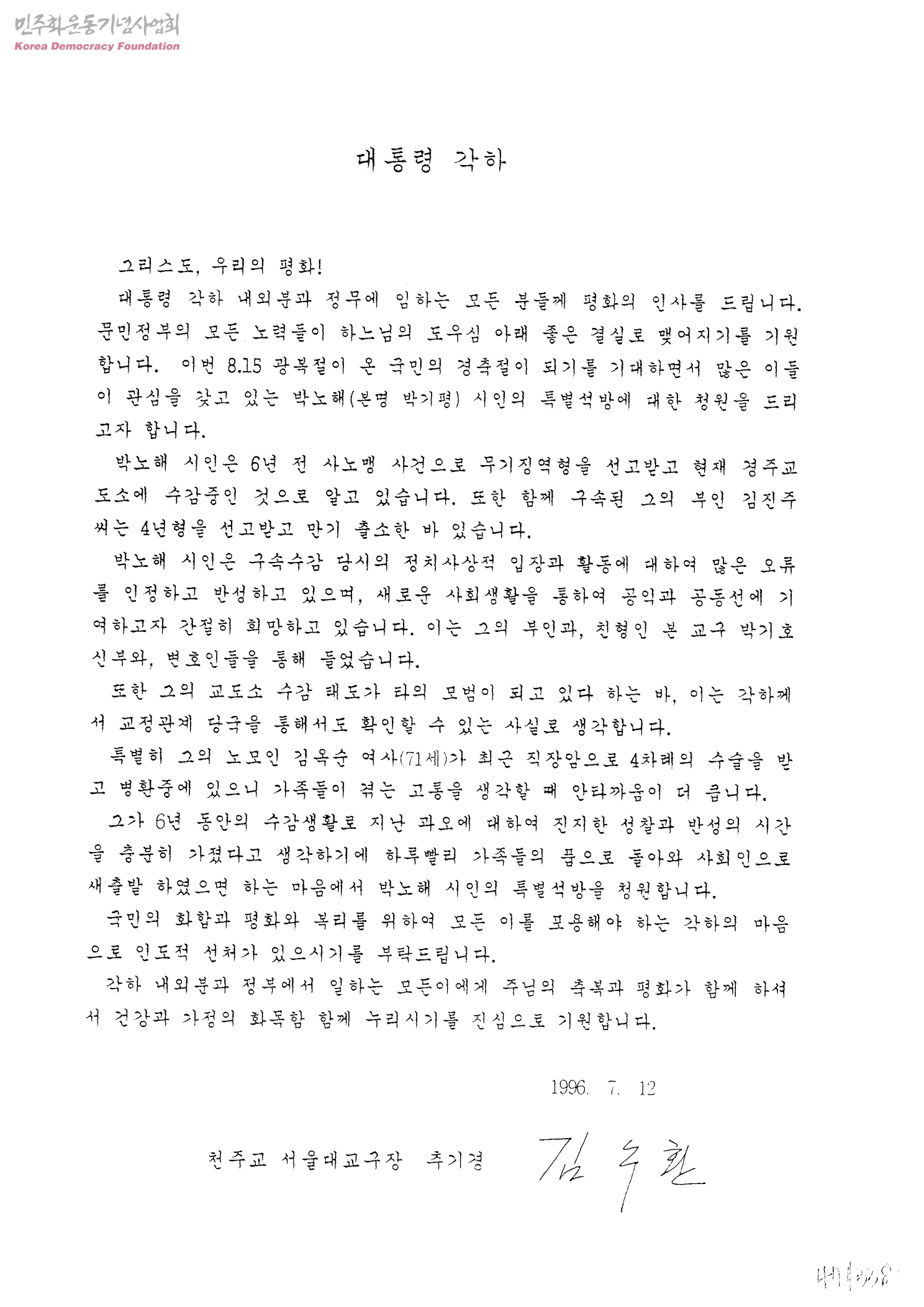 [천주교 서울대교구장 추기경 김수환이 대통령에게 박노해시인의 석방을 청원하며 쓰는 편지]