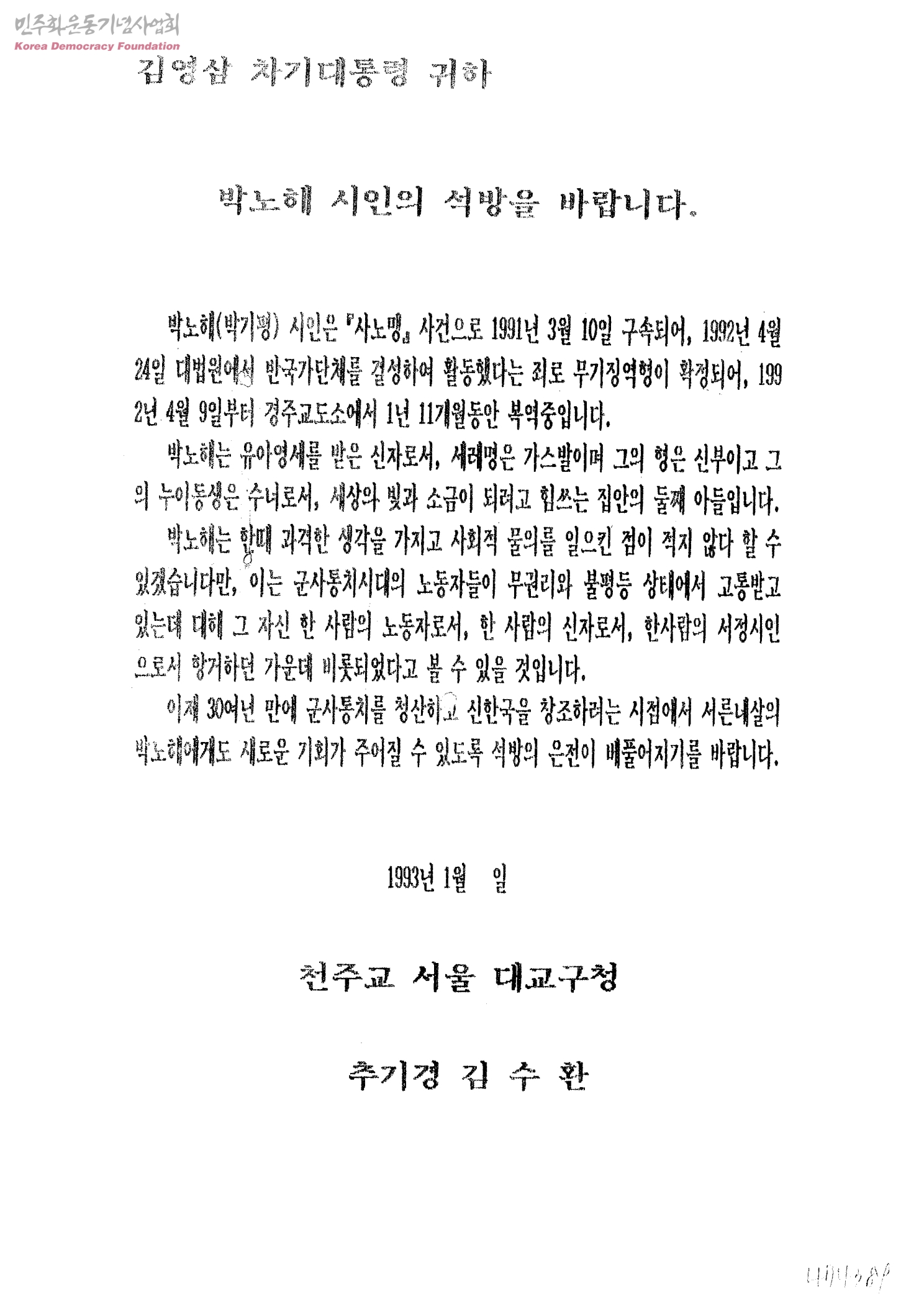 [천주교 서울대교구장 추기경 김수환이 김영삼 차기 대통령에게 박노해시인의 석방을 청원하며 쓰는 편지