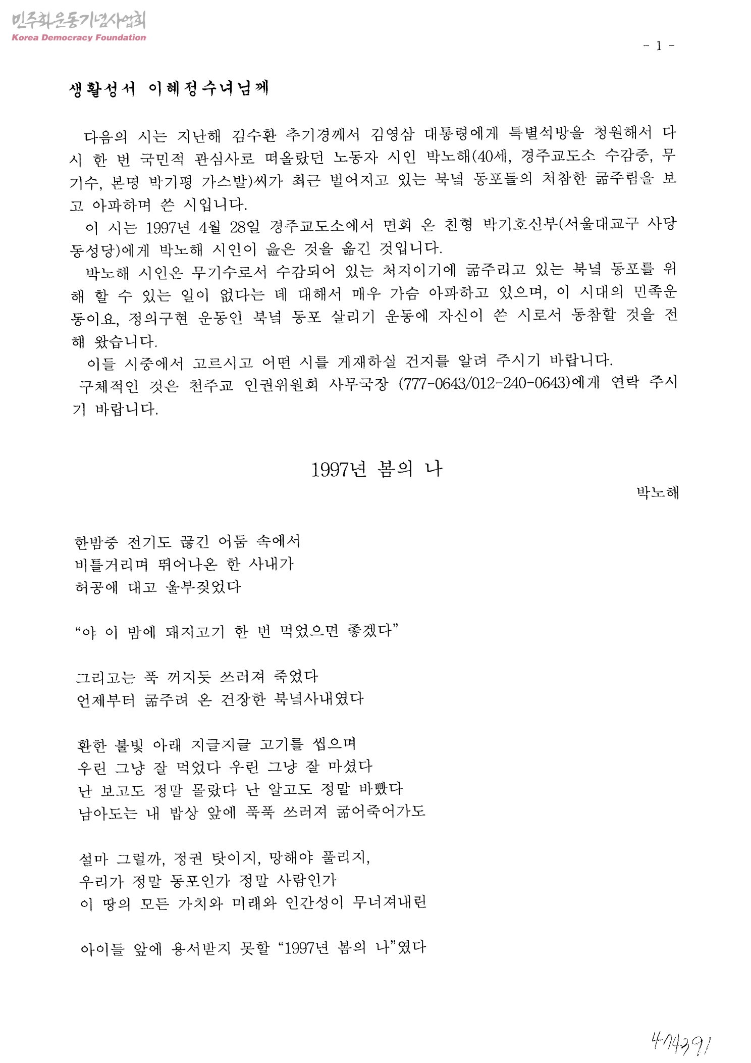 생활성서 이혜정수녀님께[박노해가 북녘동포들의 처참한 굶주림을 보고 아파하며 쓴 시]