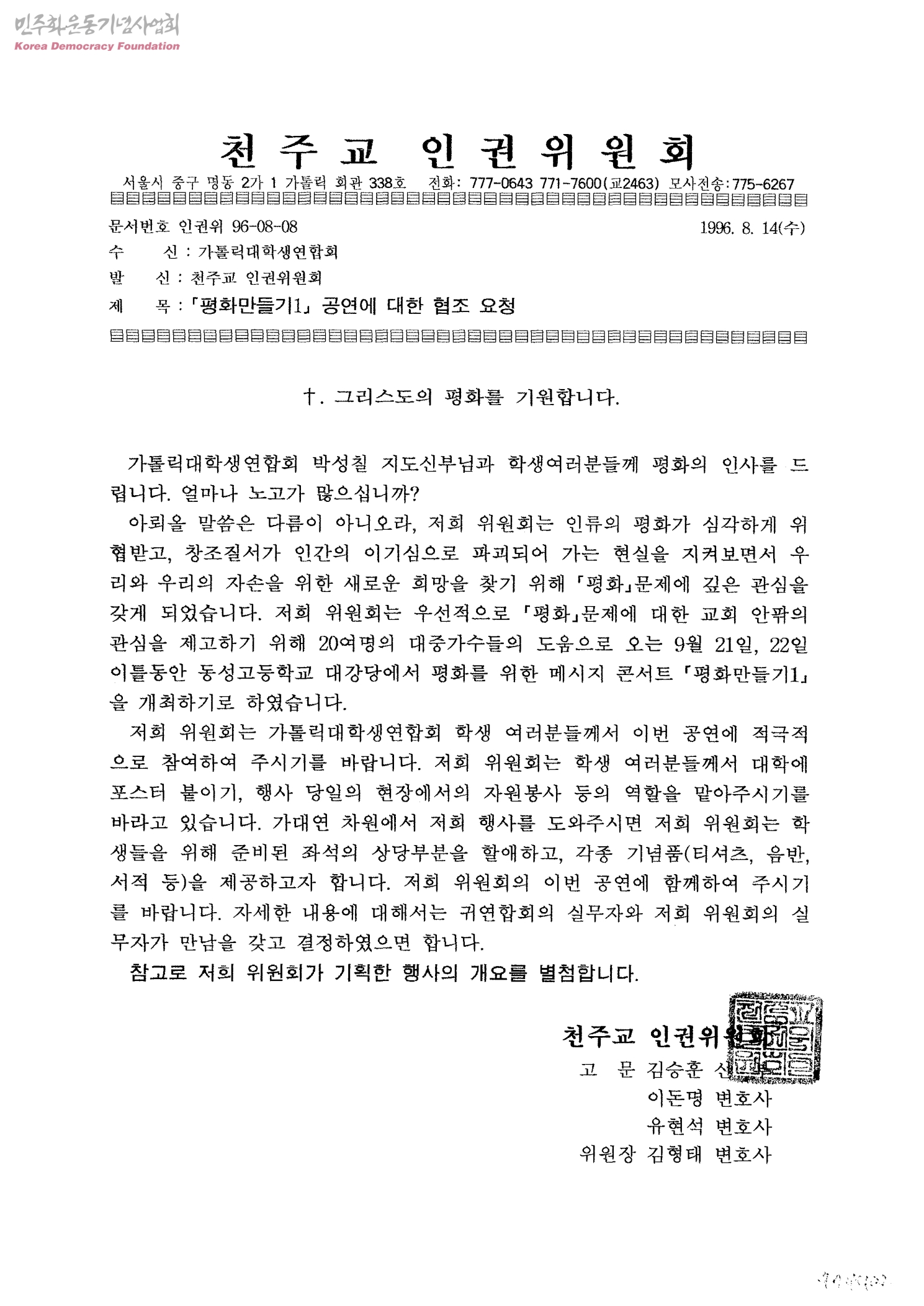 - 첨부 : 천주교인권위원회가 대중가수들과 함께 만드는 콘서트 평화만들기1-희망은 있는가, 천주교인권위원회, 1996-09-21