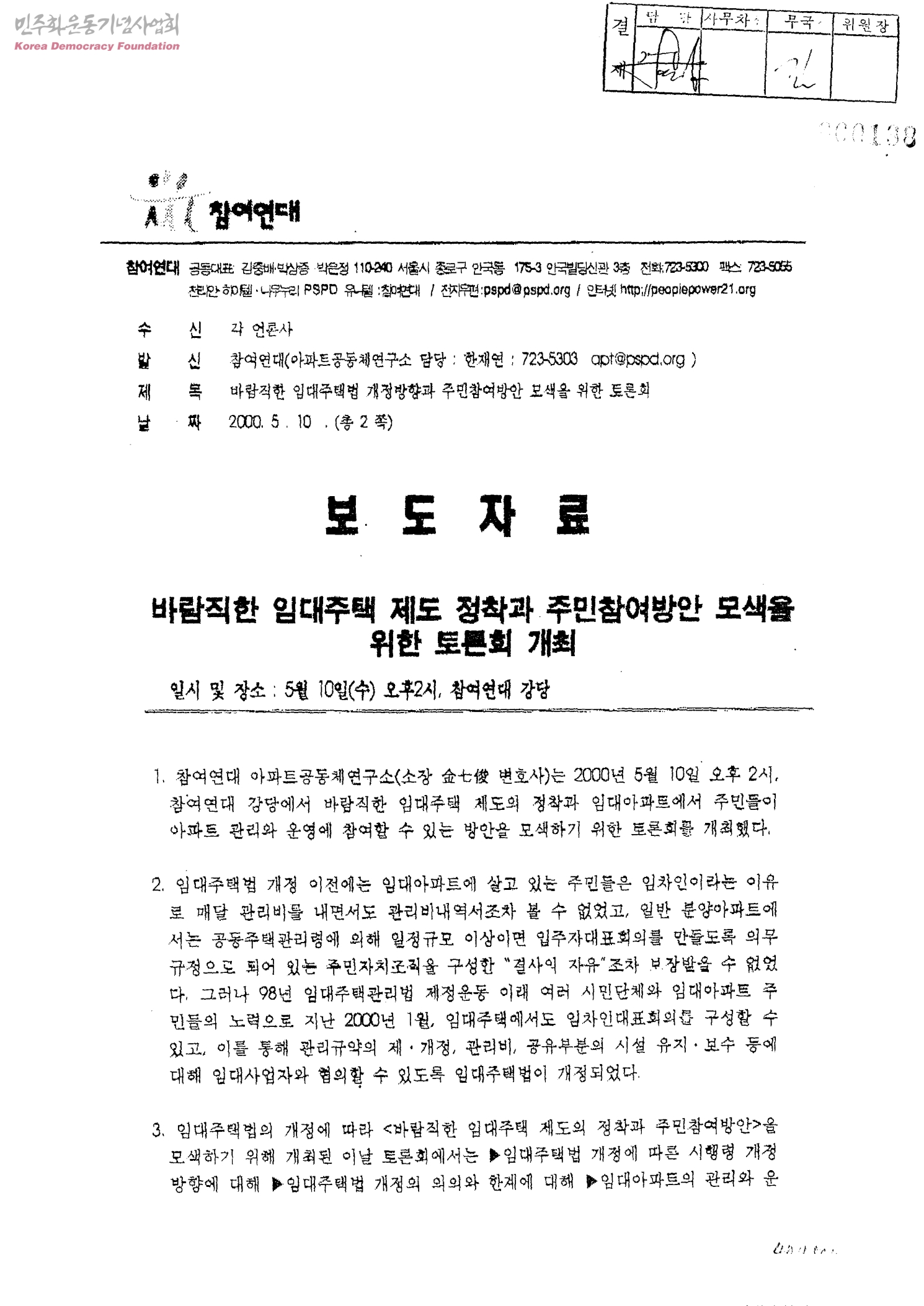 바람직한 임대주택법 개정방향과 주민참여방안 모색을 위한 토론회[수신:각 언론사, 발신:참여연대]