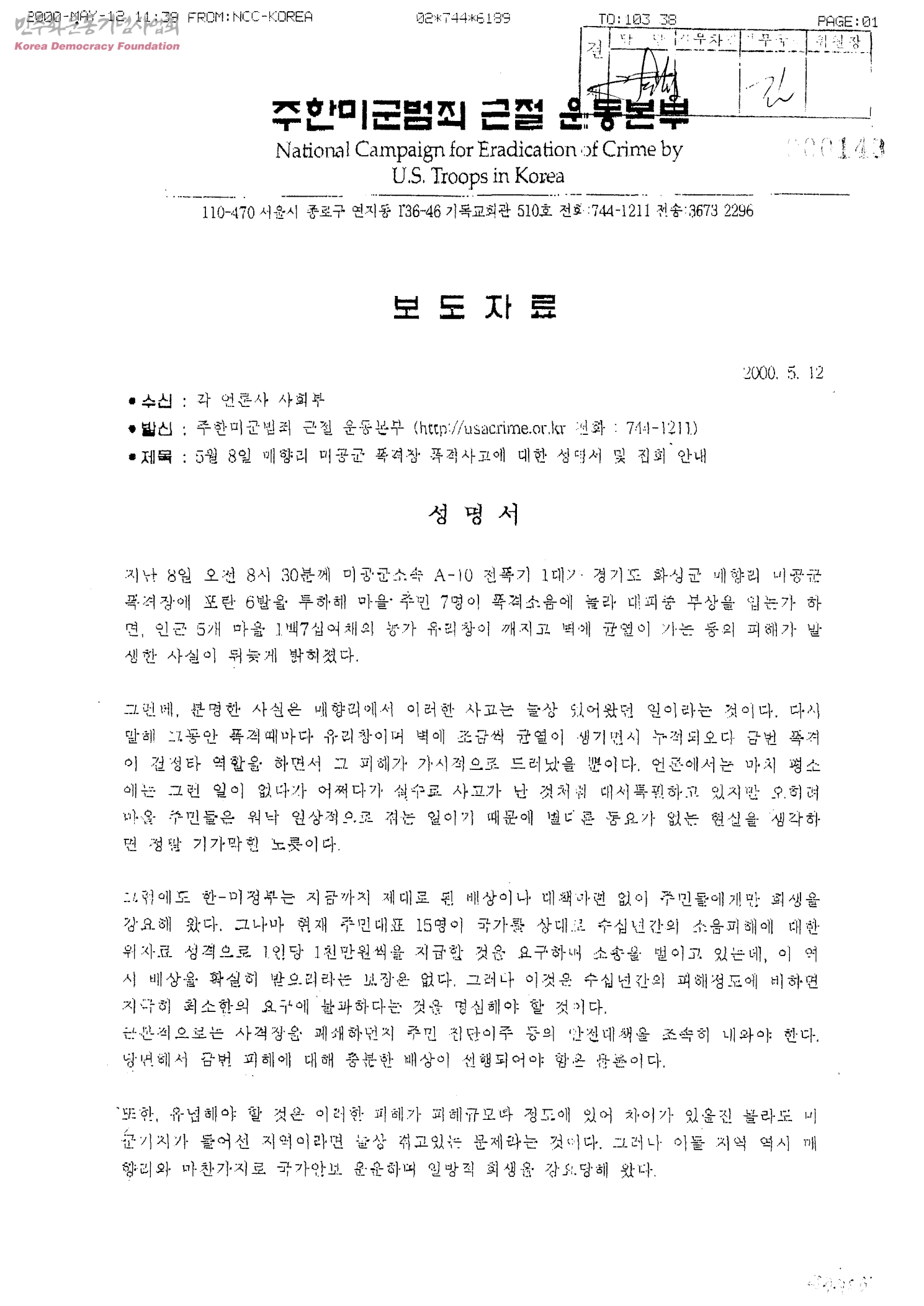 5월8일 매향리 미공군 폭격장 폭격사고에 대한 성명서 및 집회 안내[수신:각 언론사 사회부, 발신:주한미군범죄 근절 운동본부]