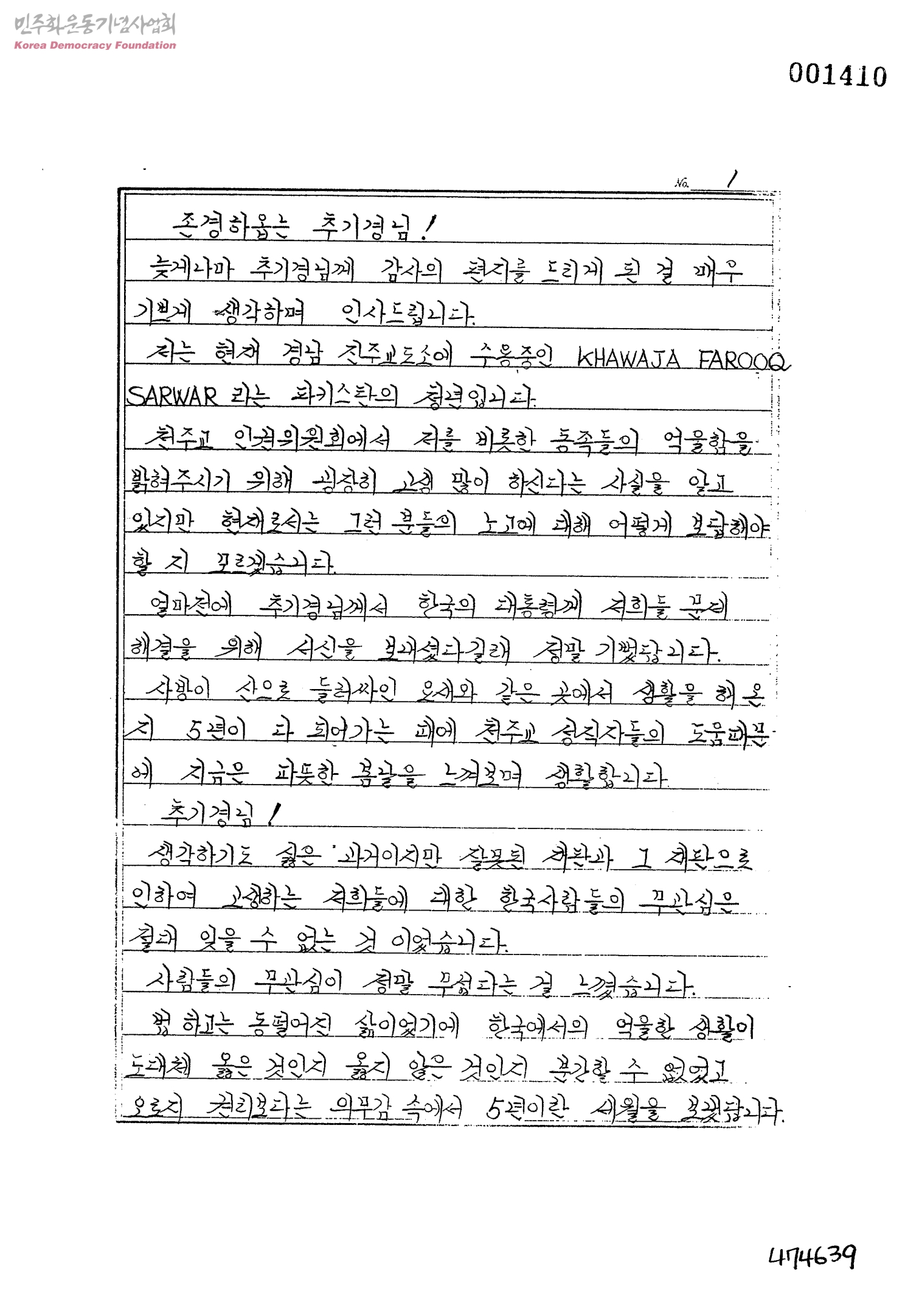[Khawaja Farooq Sarwar가 추기경에게 보내는 감사의 편지]