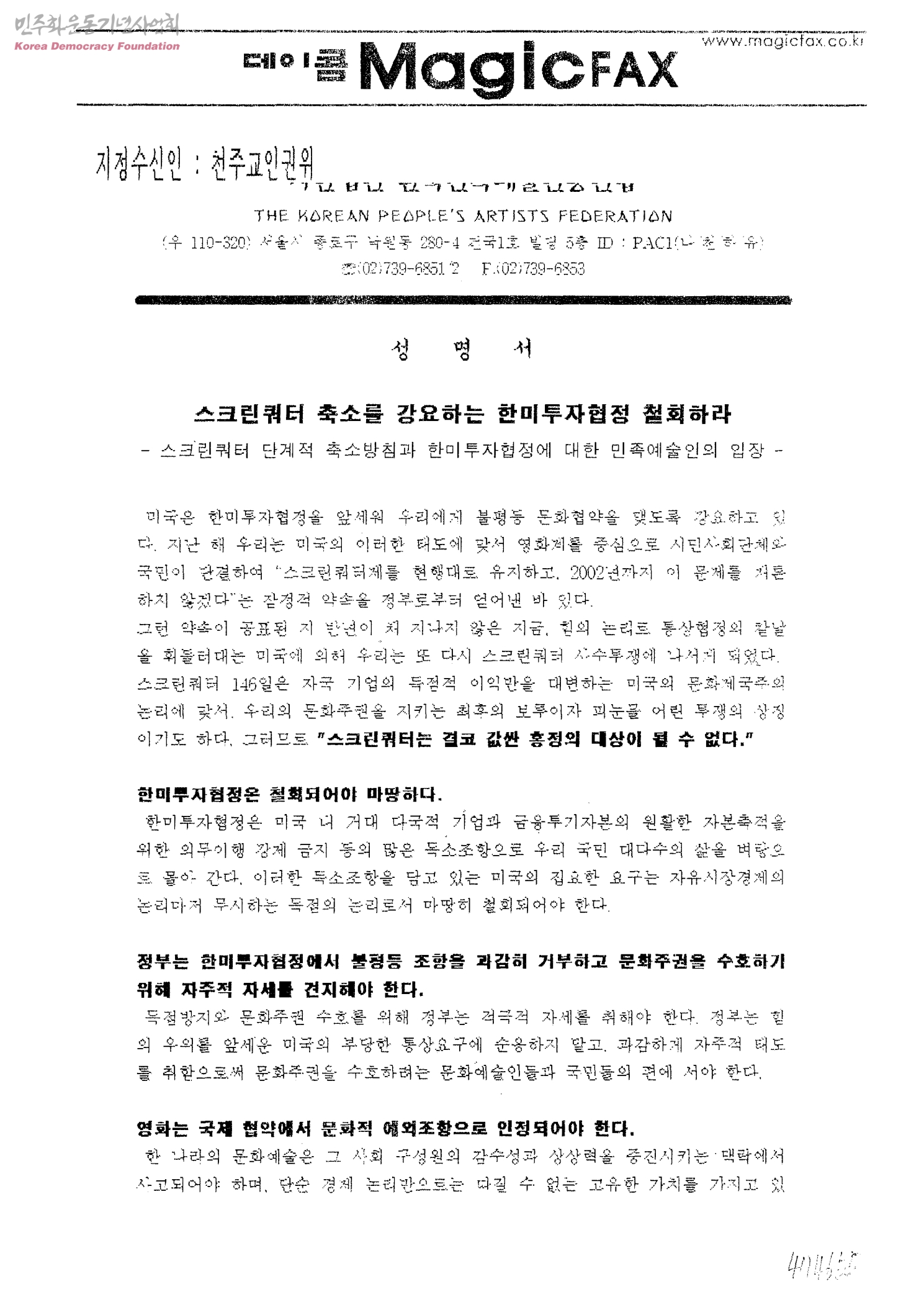 <성명서>스크린쿼터 축소를 강요하는 한미투자협정 철회하라-스크린쿼터 단계적 축소방침과 한미투자협정에 대한 민족예술인의 입장[수신:천주교인권위]