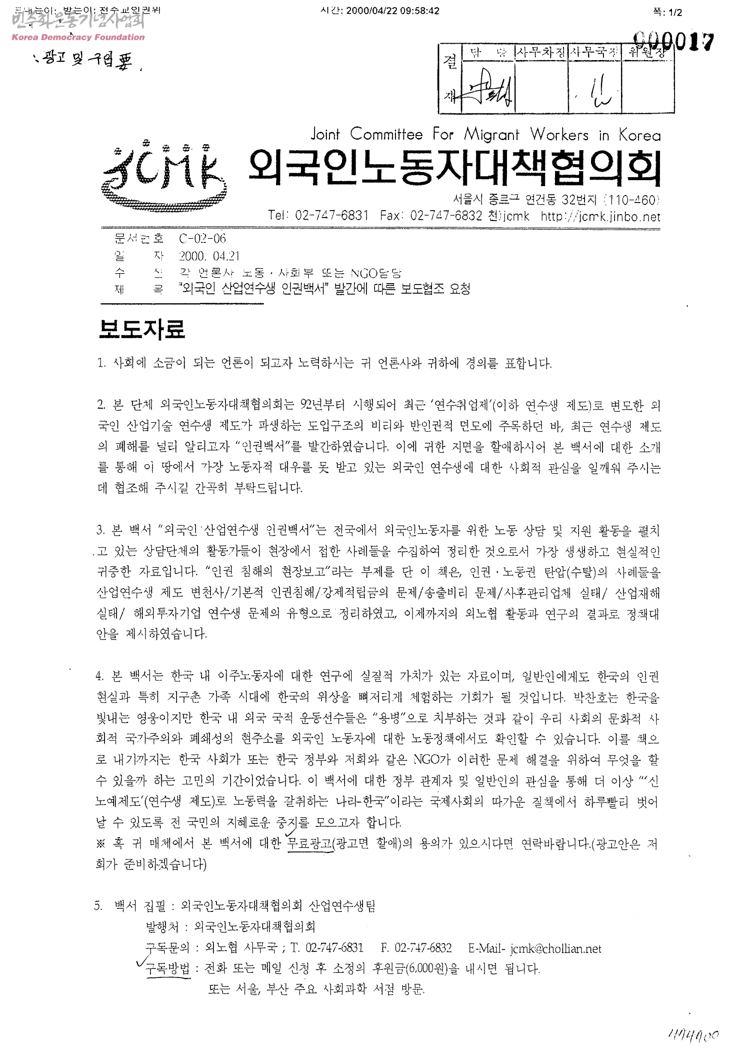 "외국인 산업연수생 인권백서" 발간에 따른 보도협조 요청[수신:각 언론사 노동·사회부 또는 NGO담당]