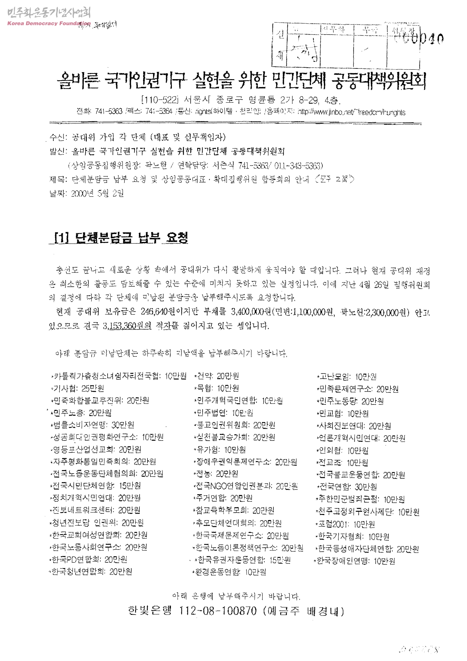 단체분담금 납부 요청 및 상임공동대표·확대집행위원 합동회의 안내[수신:공대위 가입 각 단체(대표 및 실무책임자), 발신:올바른 국기인권위 실현을 위한 민간단체 공동대책위원회]