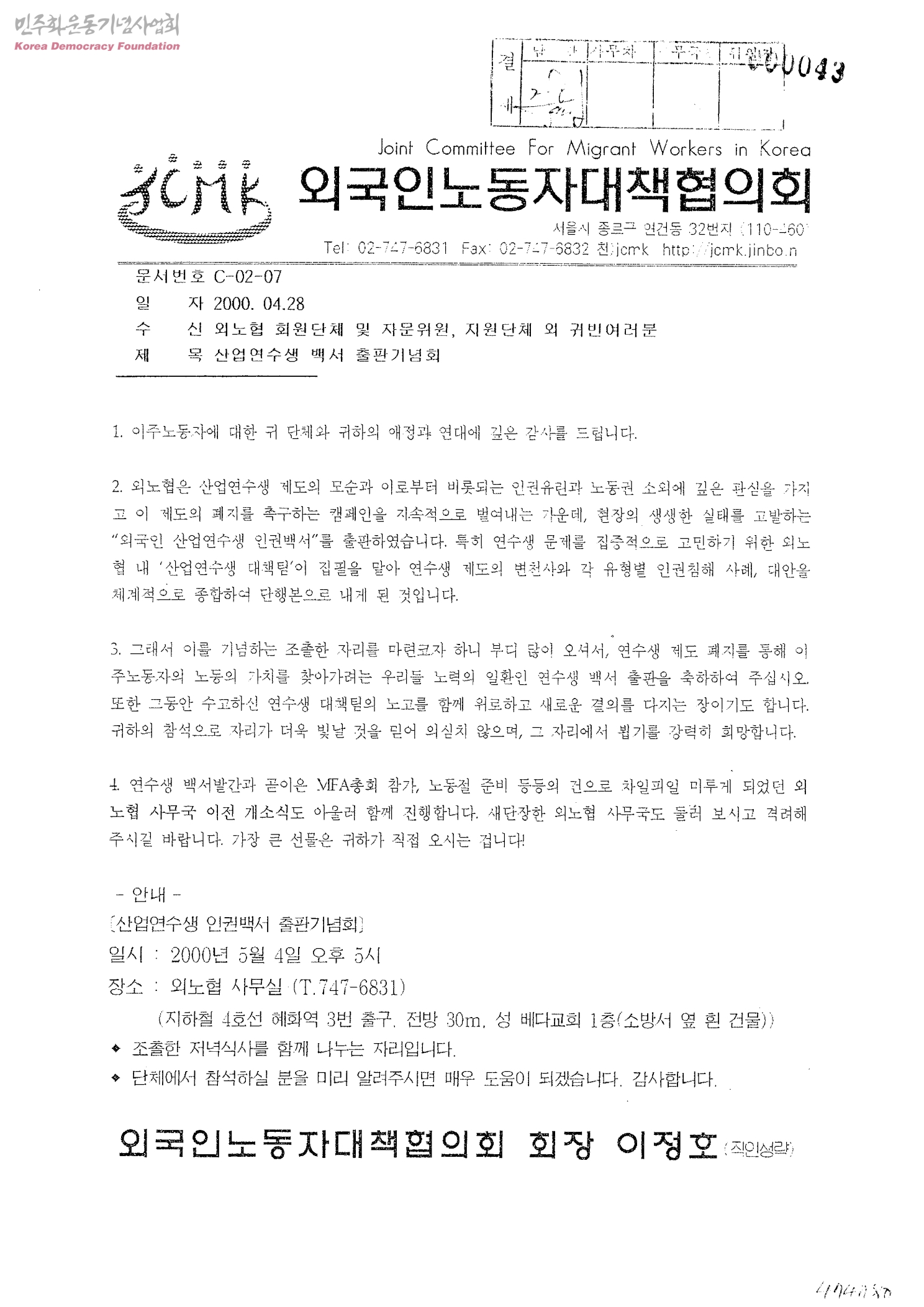 산업연수생 백서 출판기념회[수신:외노협 회원단체 및 자문위원, 지원단체 외 귀빈여러분]