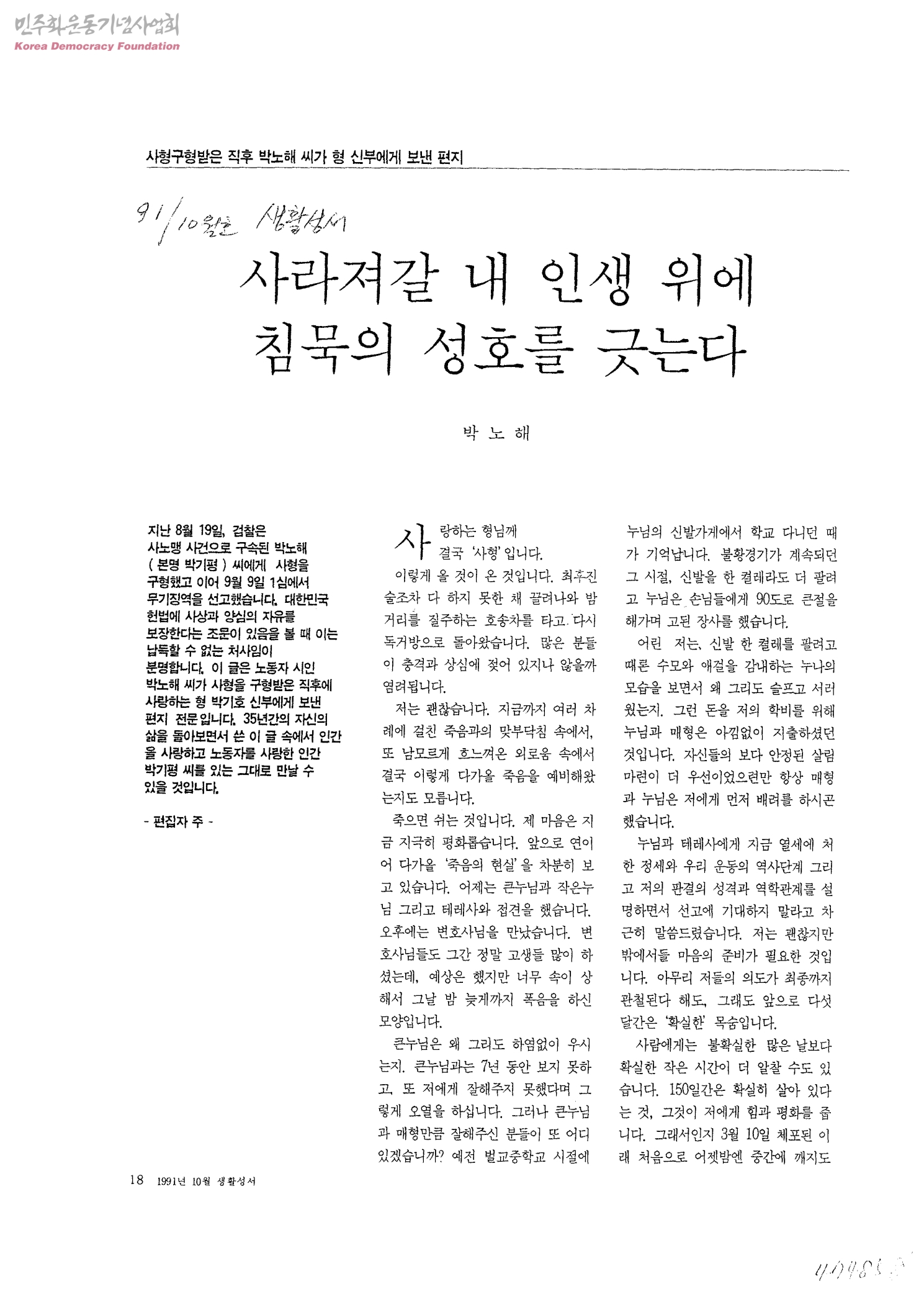 사형구형받은 직후 박노해 씨가 형 신부에게 보낸 편지-사라져갈 내 인생 위에 침묵의 성호를 긋는다