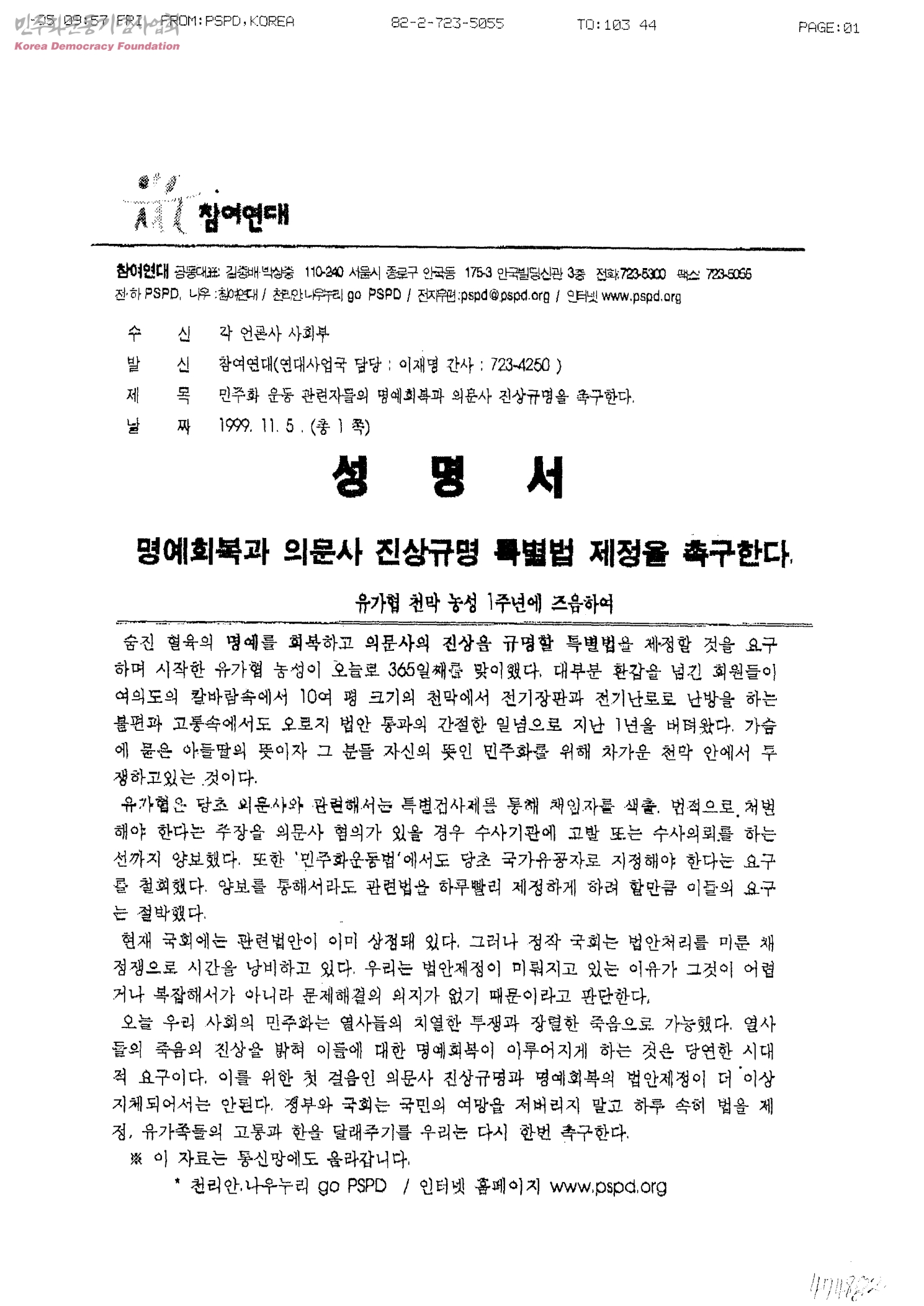 민주화 운동 관련자들의 명예회복과 의문사 진상규명을 촉구한다.[수신:각언론사 사회부, 발신:참여연대]
