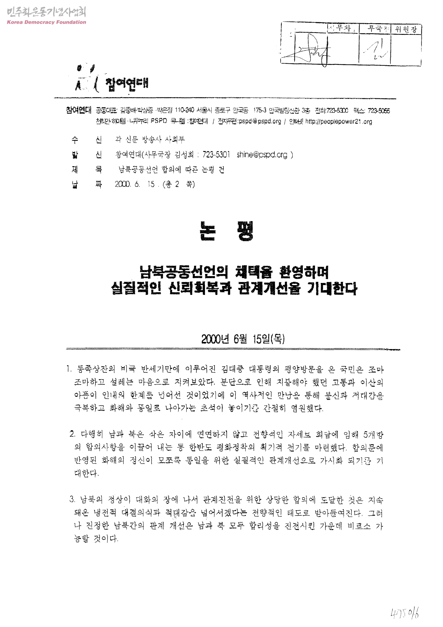 남북공동선언 합의에 따른 논평 건[수신:각 신문 방송사 사회부, 발신:참여연대]