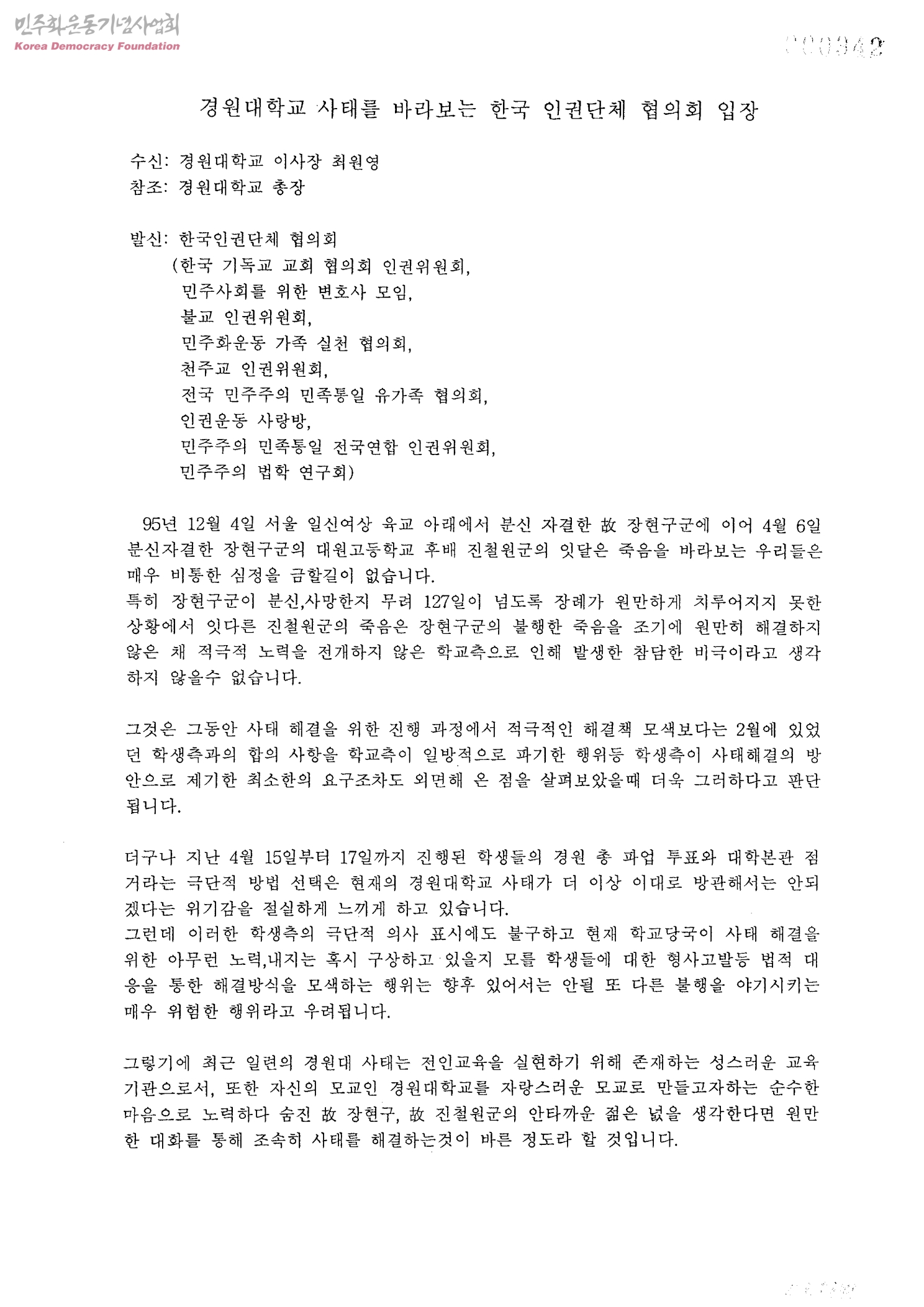 경원대학교 사태를 바라보는 한국 인권단체 협의회 입장[수신:경원대학교 이사장 최원영]