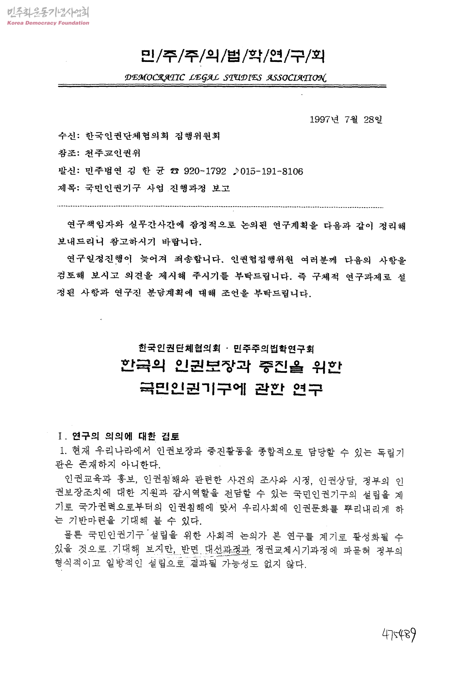 국민인권기구 사업 진행과정보고[수신:한국인권단체협의회 집행위원회, 발신:민주법연 김한균]
