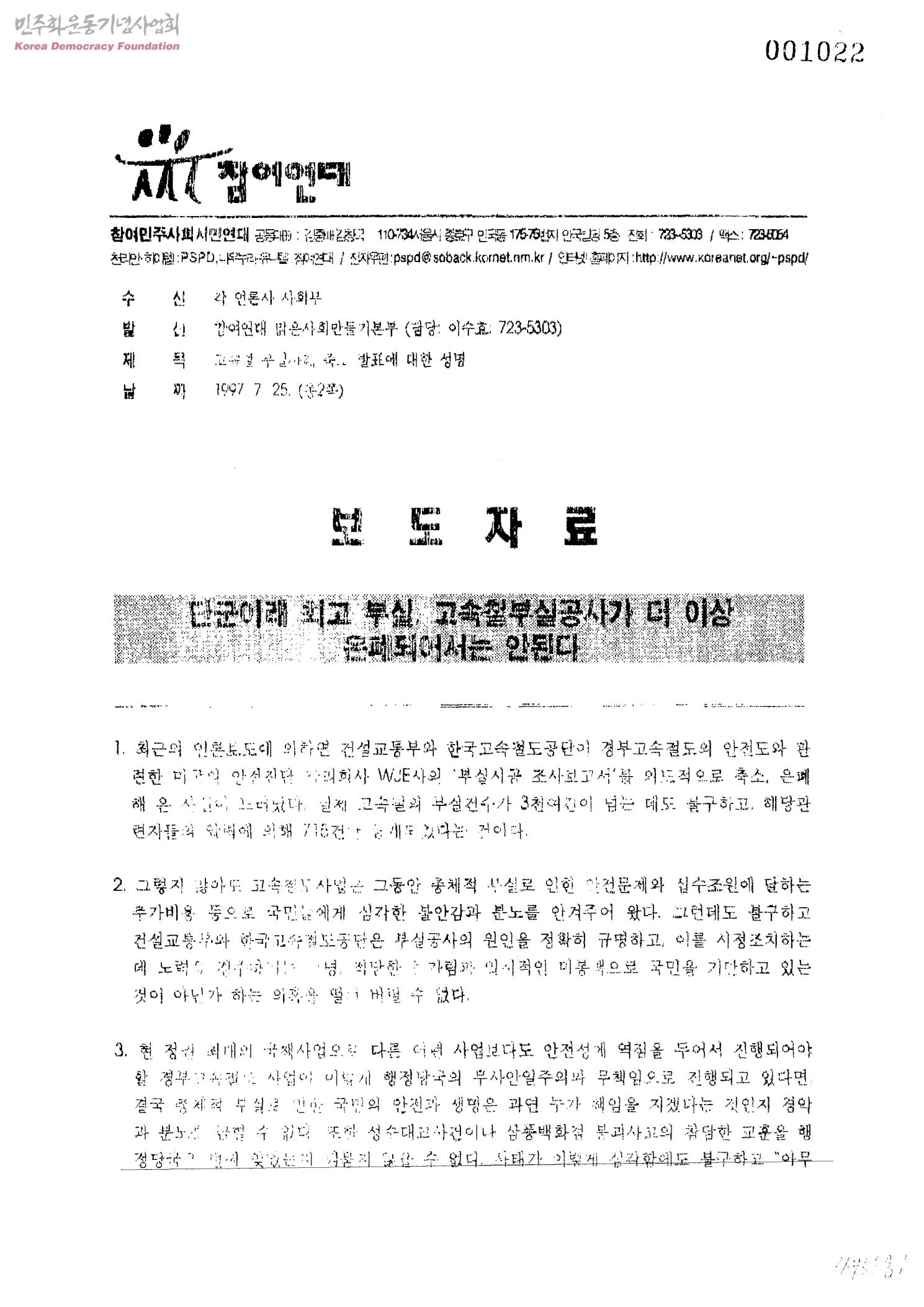 고속철부실사례 축소 발표에 대한 발표[수신:각 언론사 사회부, 발신:참여연대 맑은사회만들기본부]