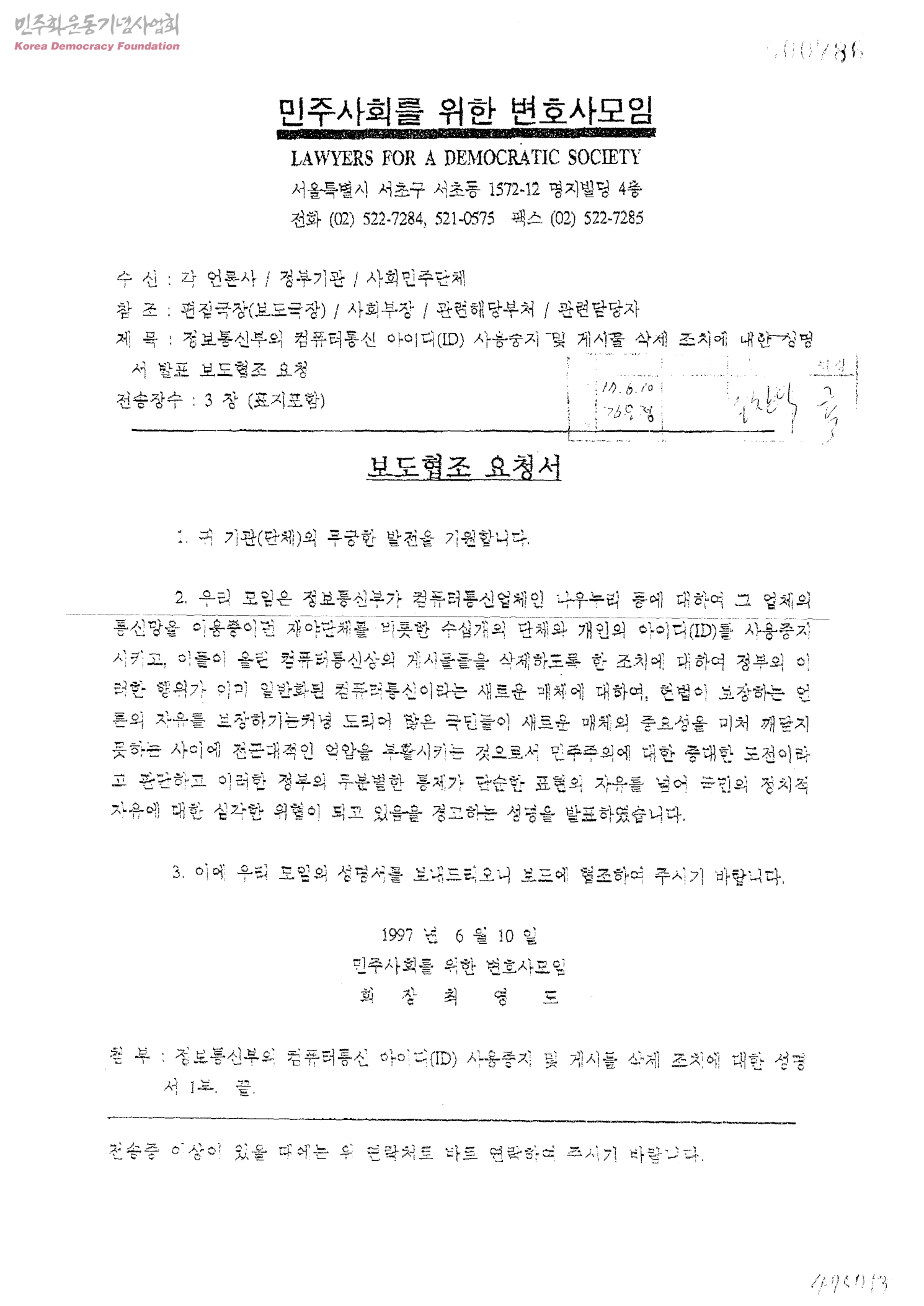 정보통신의 컴퓨터통신 아이디(ID) 사용중지 및 게시말 삭제 조치에 대한 성명서 발표 보도협조 요청[수신:각 언론사, 정부기관, 사회민주단체]