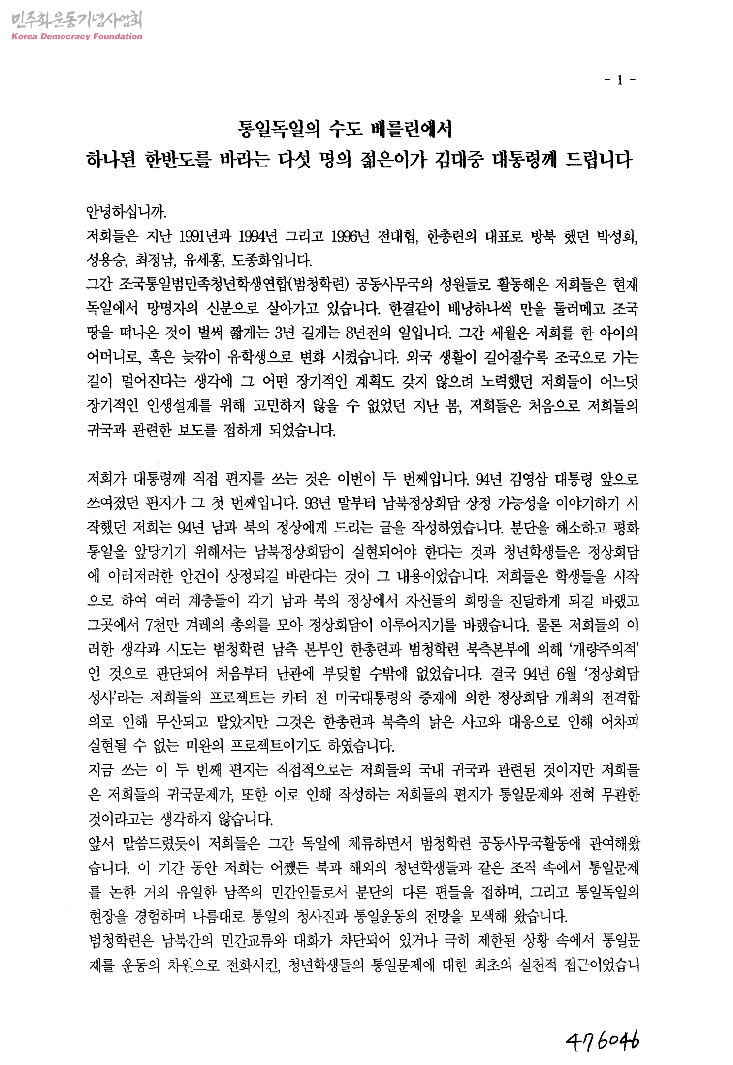 통일독일의 수도 베를린에서 하나된 한반도를 바라는 다섯 명의 젊은이가 김대중 대통령께 드립니다