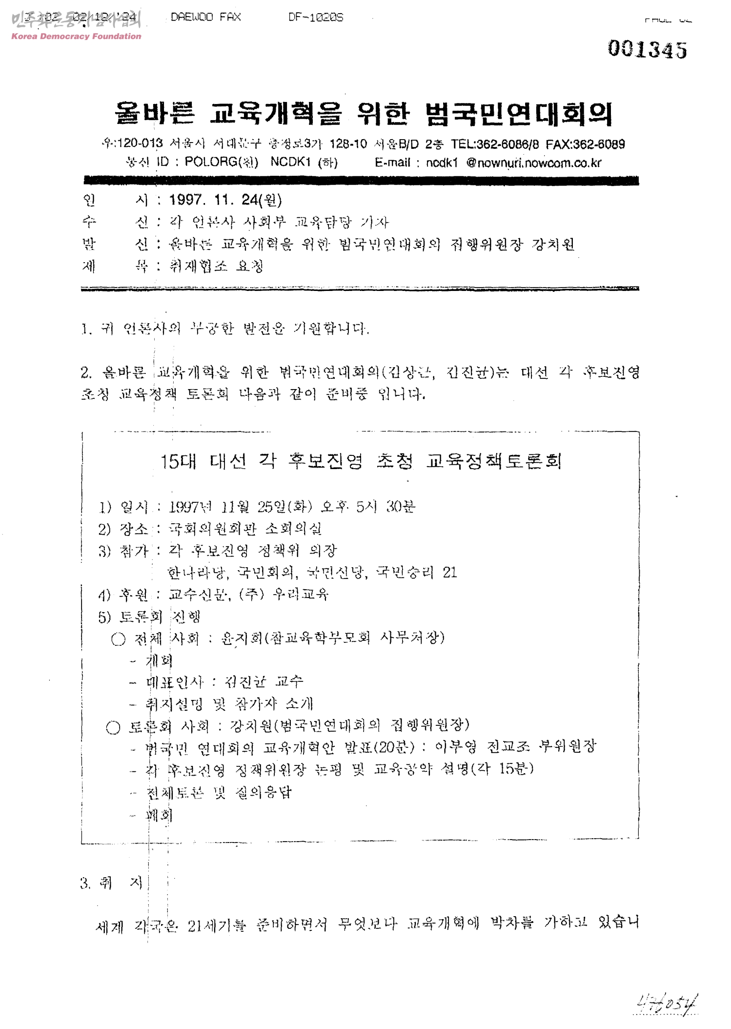 취재협조 요청[15대 대선 각 후보진영 초청교육정책토론회 관련][수신:각 언론사 사회부 교육담당 기자, 발신:올바른 교육개혁을 위한 범국민연대회의 집행위원장 강치원]