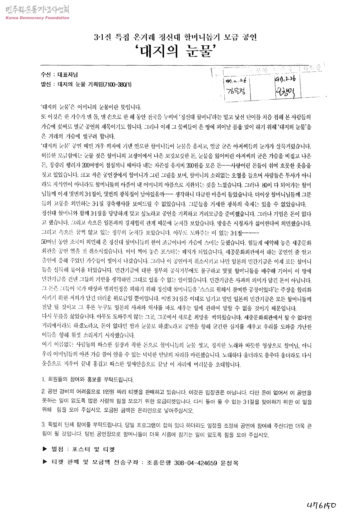3·1절 특집 온겨례 정신대 할머니돕기 모금 공연 '대지의 눈물'[수신:대표자님, 발신:대지의 눈물 기획팀]