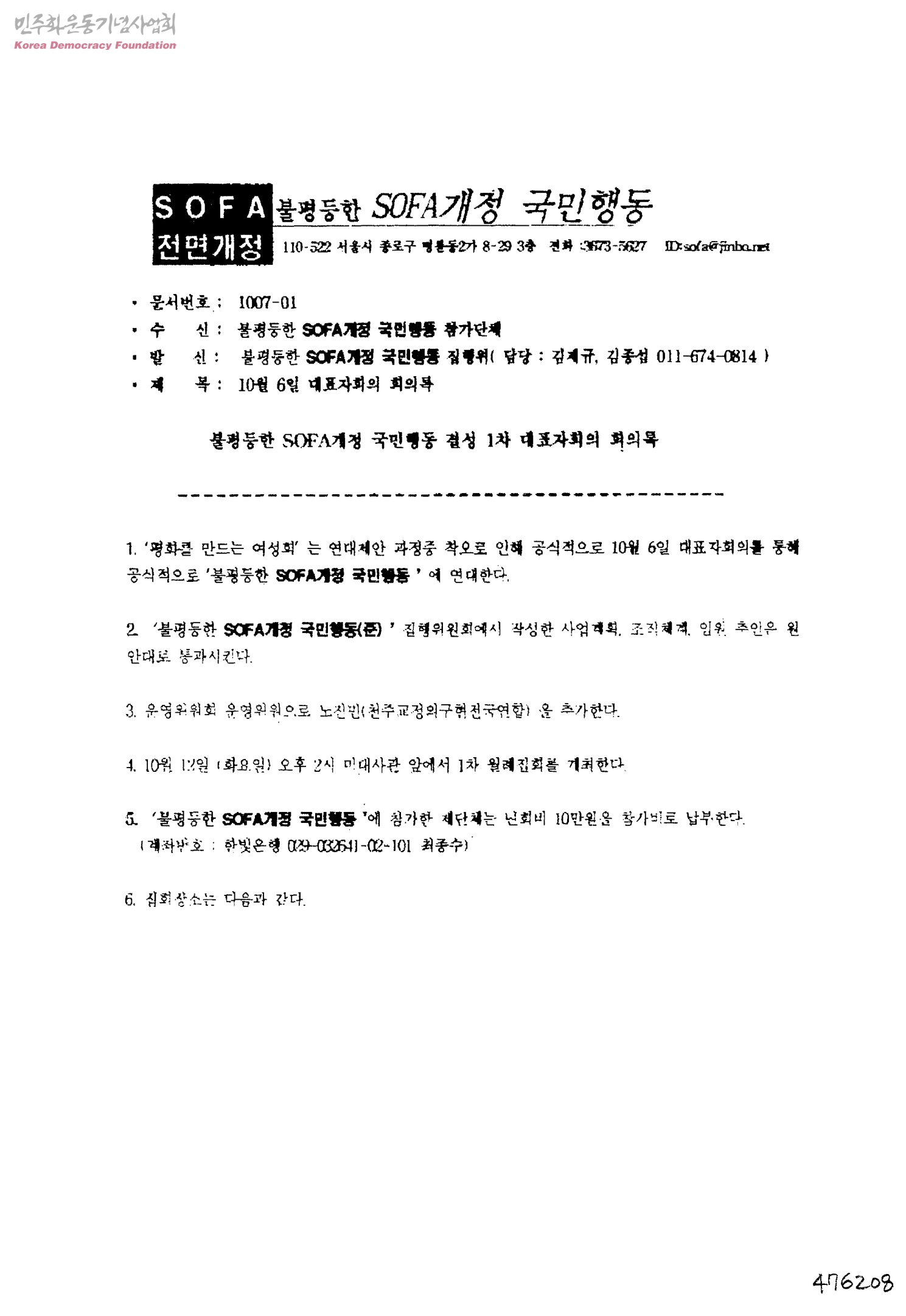 10월 6일 대표자회의 회의록[수신:불평등한 SOFA개정 국민행동 참가단체, 발신:불평등한 SOFA개정 국민행동 집행위]
