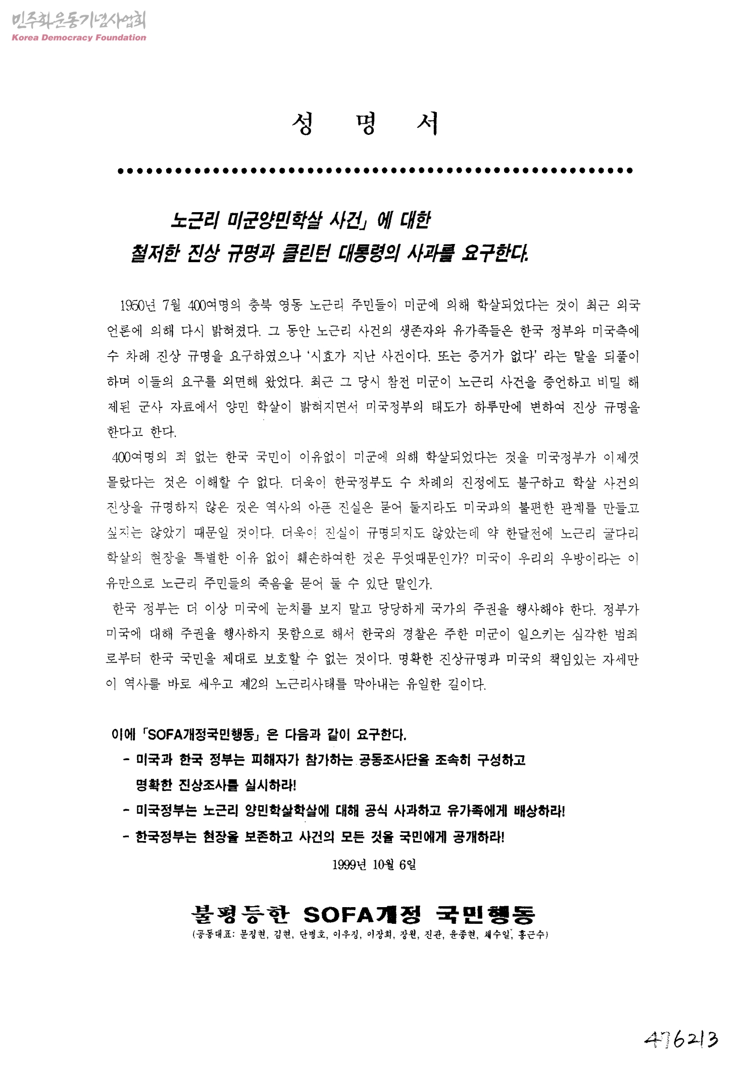 성명서-노근리 미군양민학살 사건에 대한 철저한 진상 규명과 클린턴 대통령의 사과를 요구한다