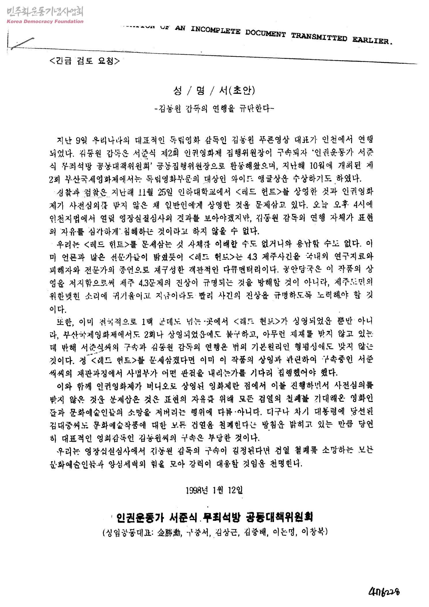 성명서(초안)-김동원 감독의 연행을 규탄한다
