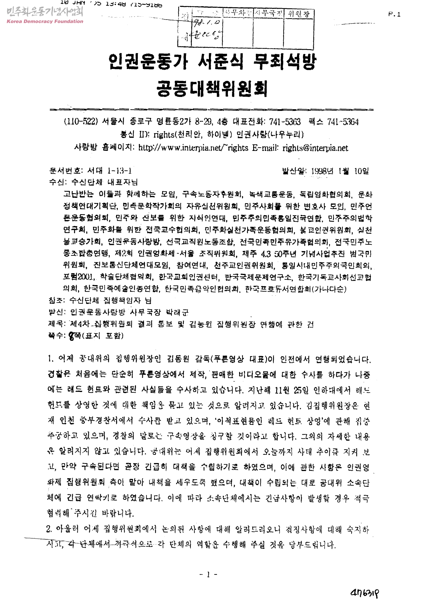 제4차 집행위원회 결과 통보 및 김동원 집행위원장 연행에 관한 건[수신:수신단체 대표자님, 발신:인권운동사랑방 사무국장 박래군]