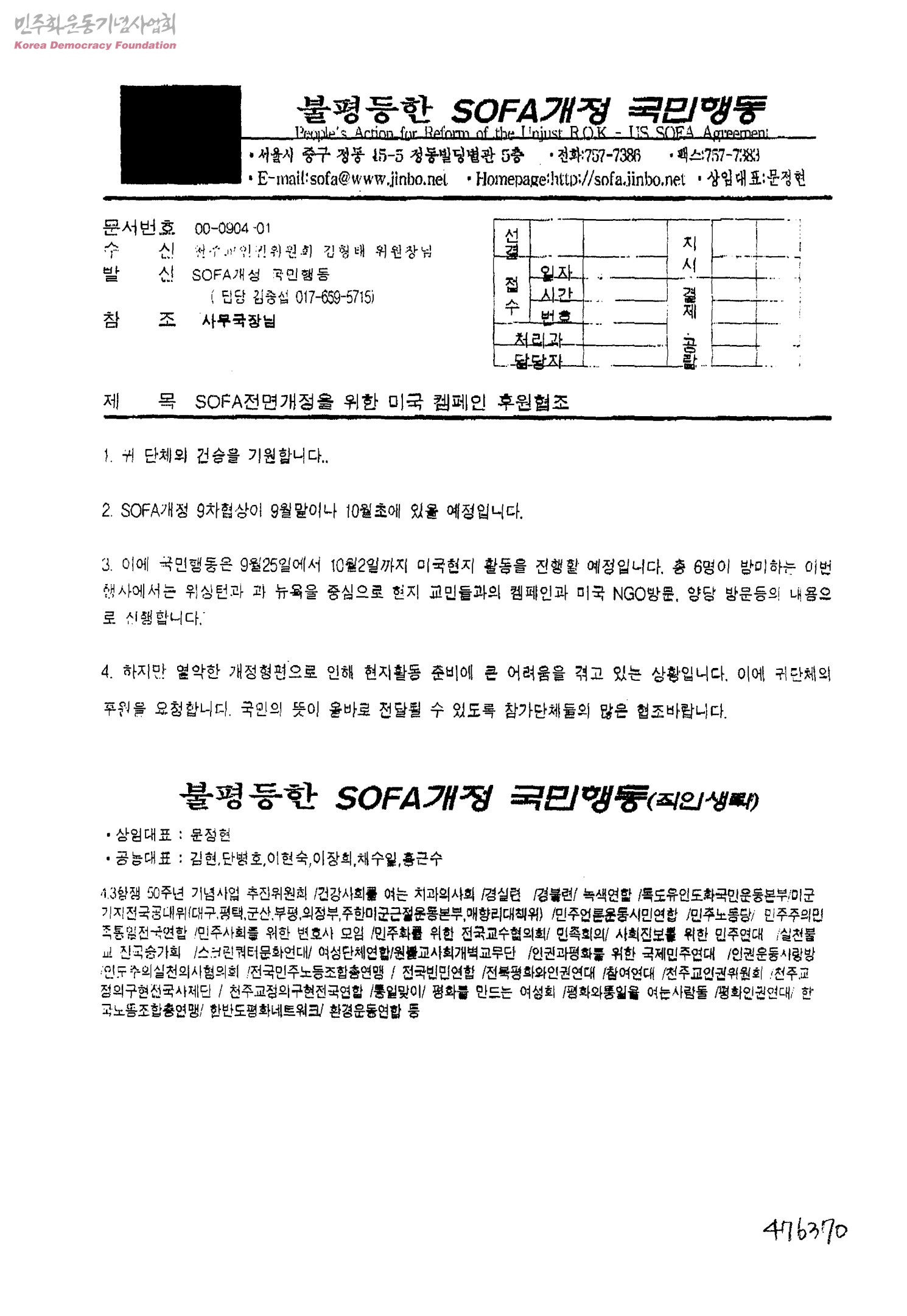 SOFA전면개정을 위한 미국 켐페인 후원협조[수신:천주교인권위원회 김형태 위원장님, 발신:SOFA개정 국민행동]