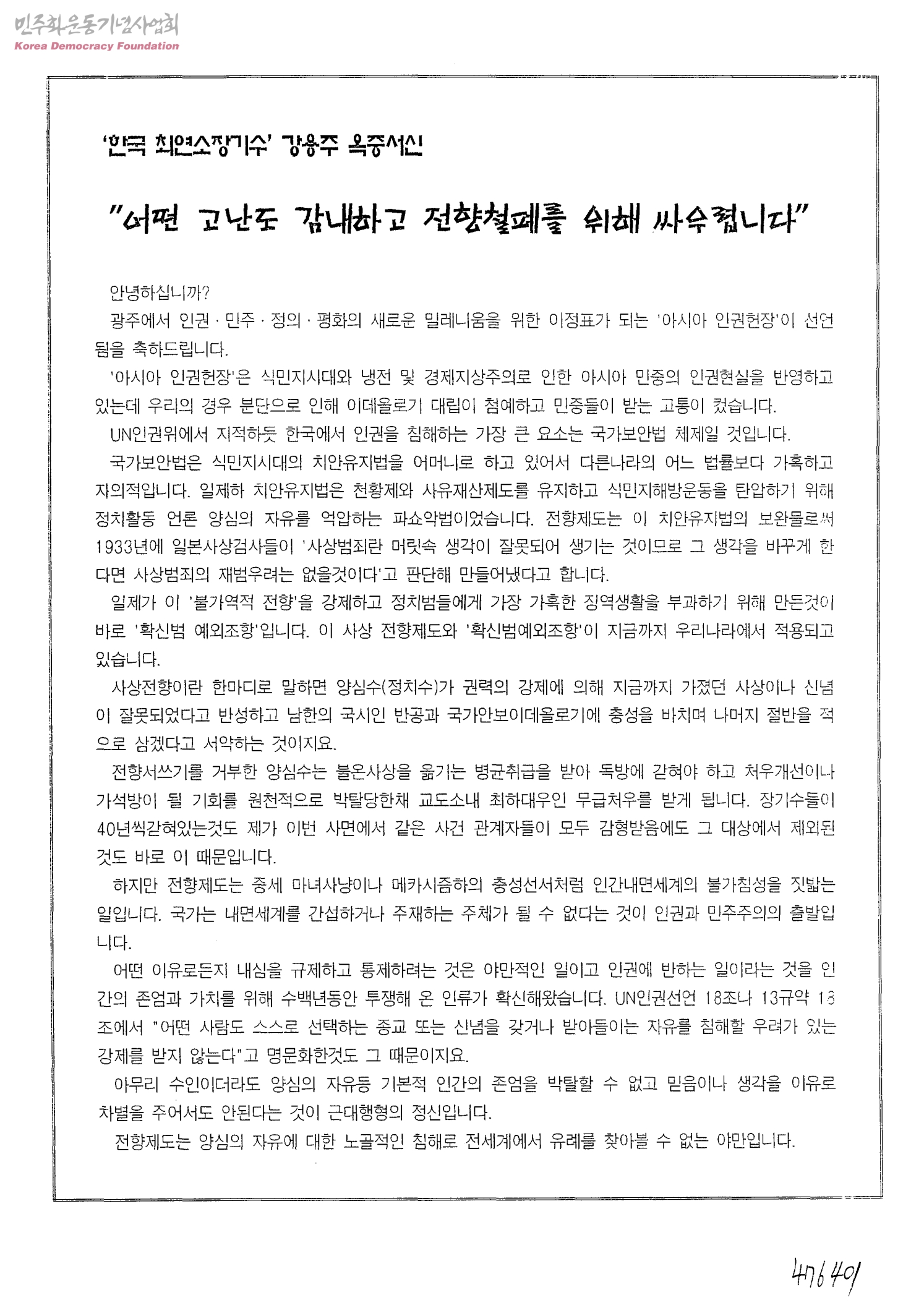 '한국 최연소장기수' 강용주 옥중서신-"어떤 고난도 감내하고 전향철폐를 위해 싸우렵니다"