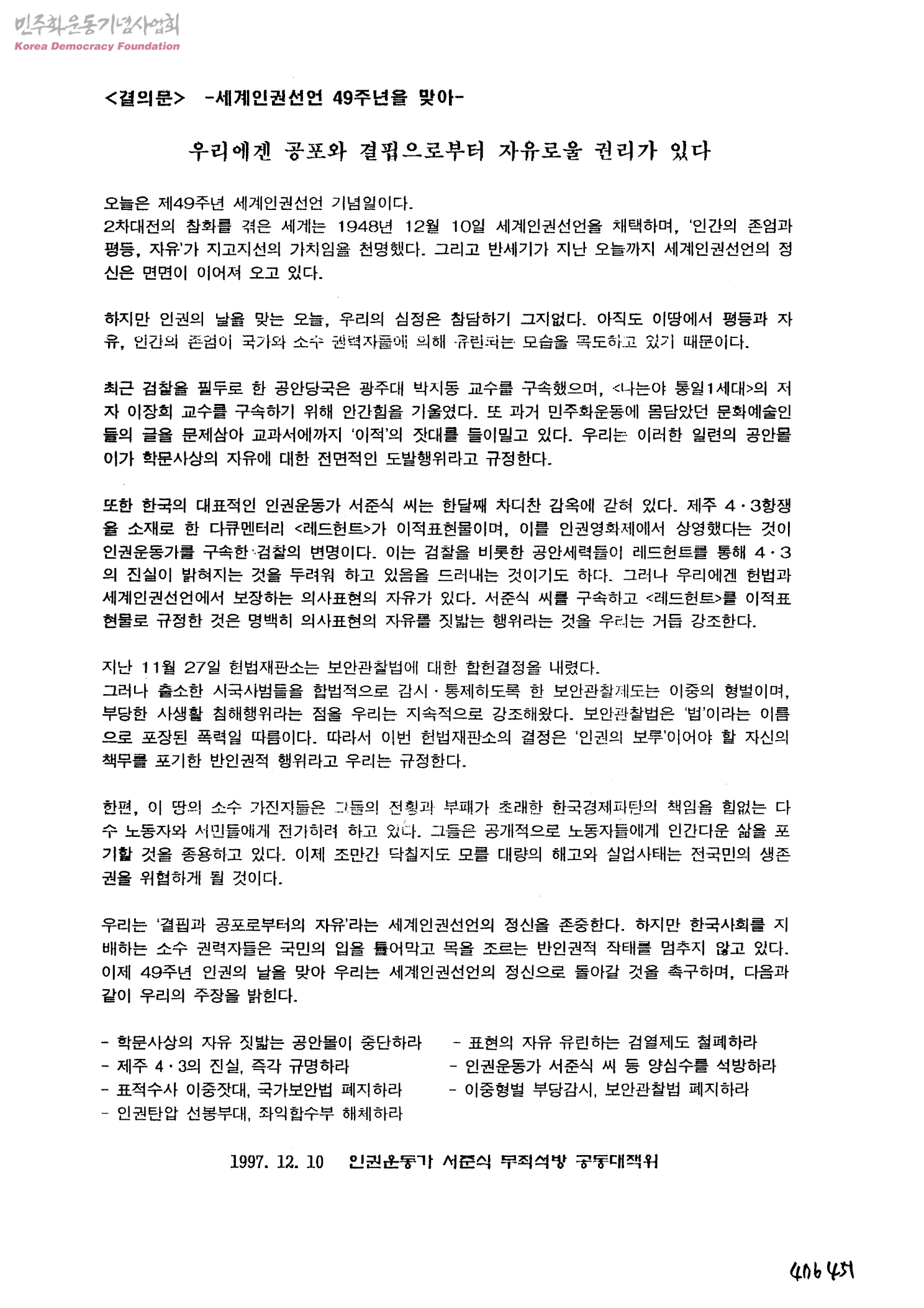 <결의문>세계인권선언 49주년을 맞아-우리에겐 공포와 결핍으로부터 자유로울 권리가 있다