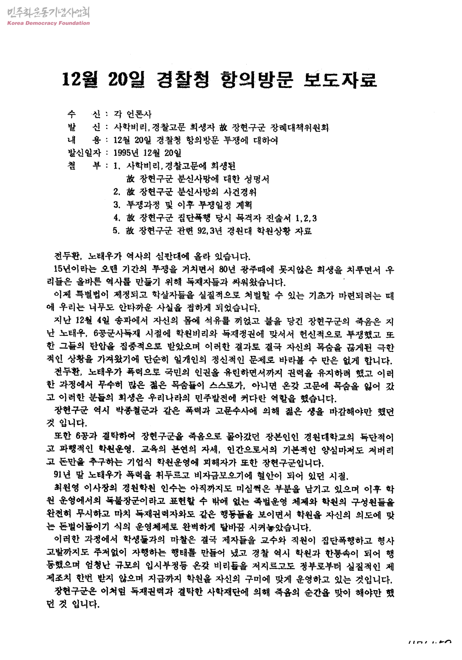 12월 20일 경찰청 항의방문 투쟁에 대하여[수신:각 언론사, 발신:사학비리, 경찰고문 희생자 故 장현구군 장례대책위원회]