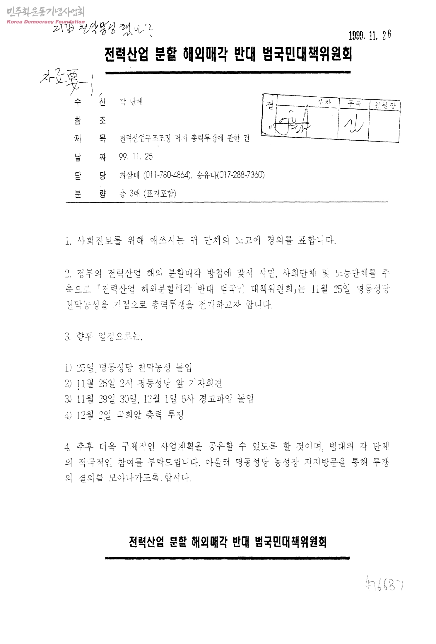 전력산업구조조정 저지 총력투쟁에 관한 건[수신:각단체]