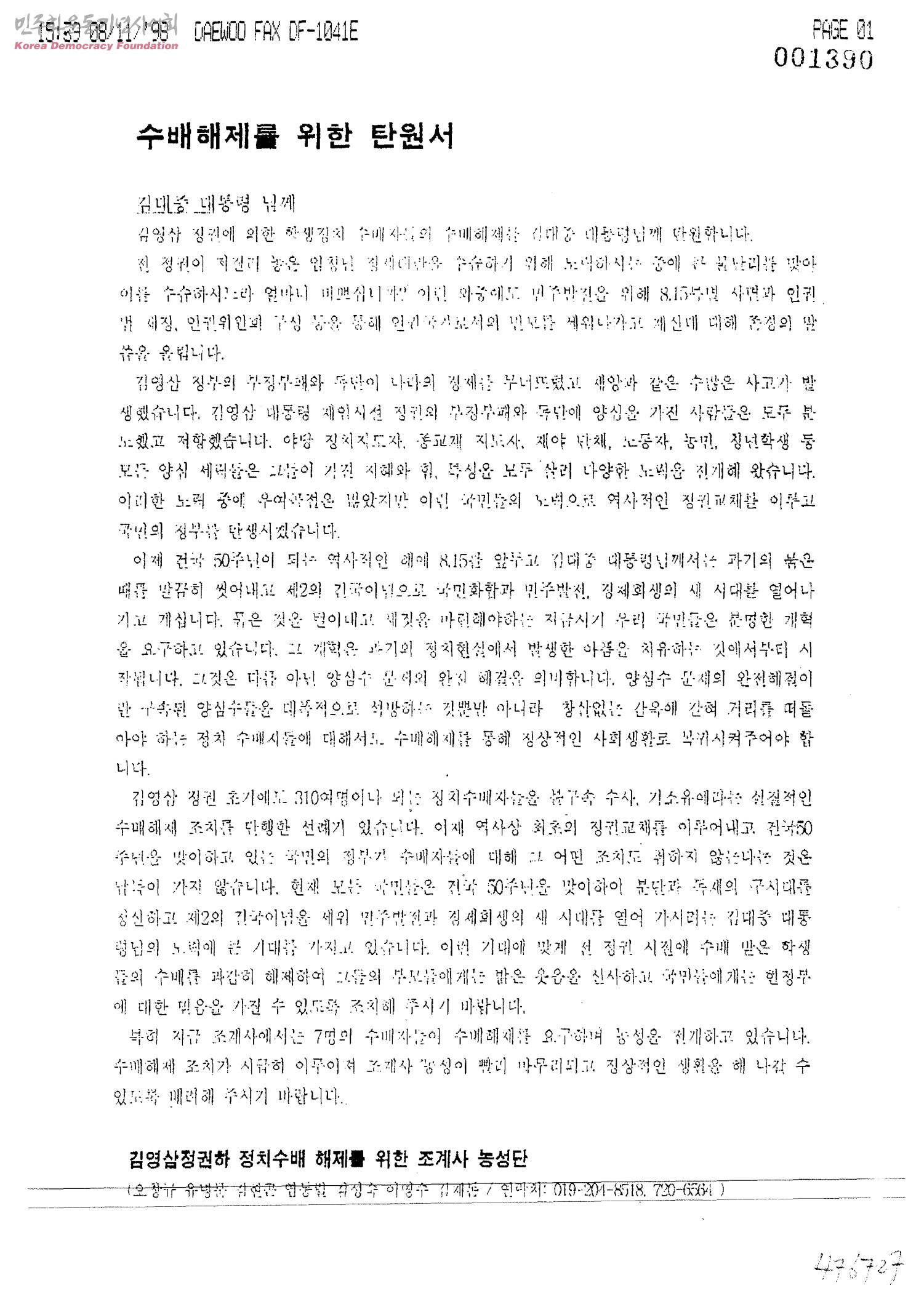 수배해제를 위한 탄원서[김영삼 정권에 의한 학생정치 수배자들의 수배해제 관련]