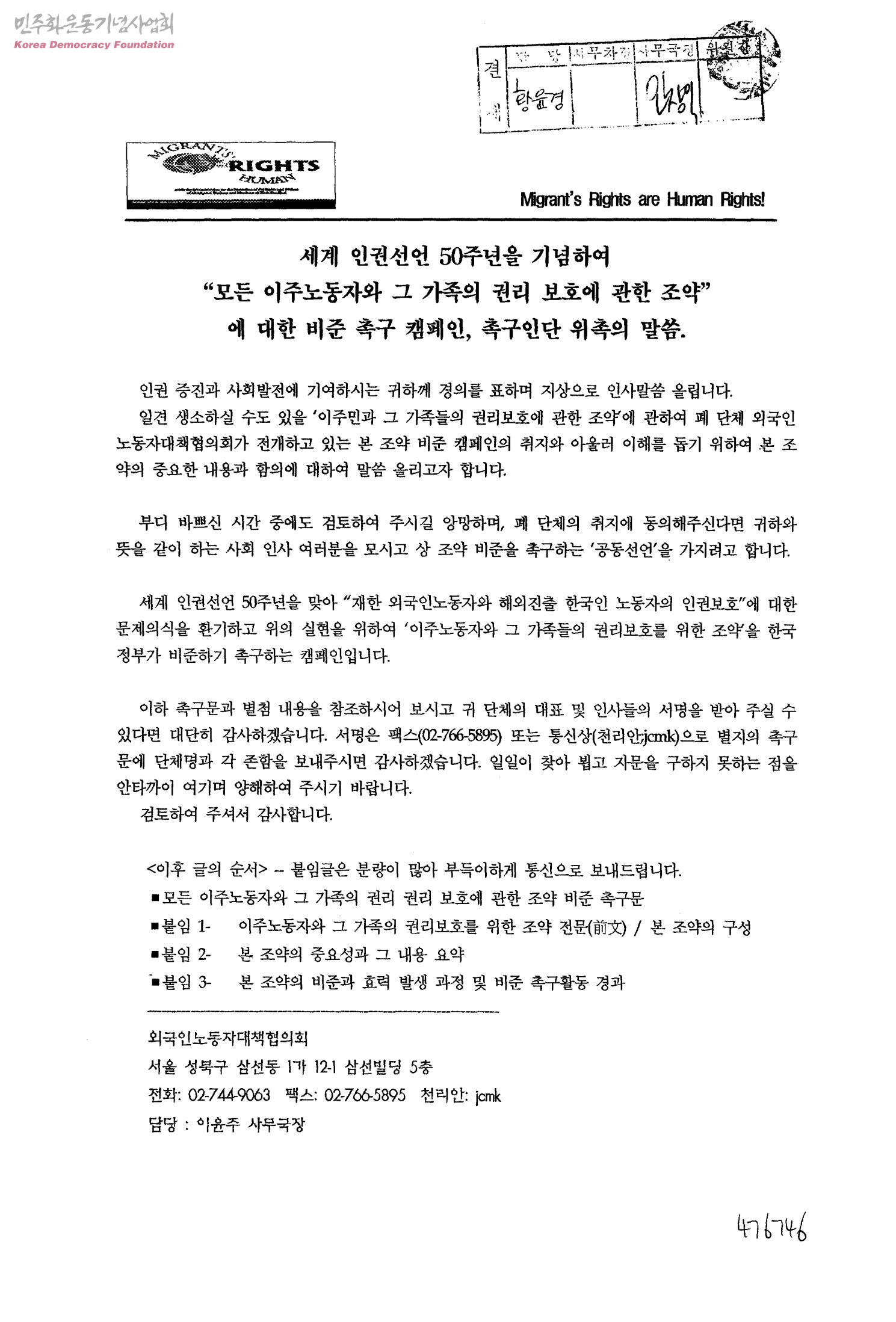 세계인권선언50주년을 기념하여 "모든 이주노동자와 그 가족의 권리보호에 관한 조약"에 대한 비준촉구 캠페인, 촉구인단 위촉의말씀