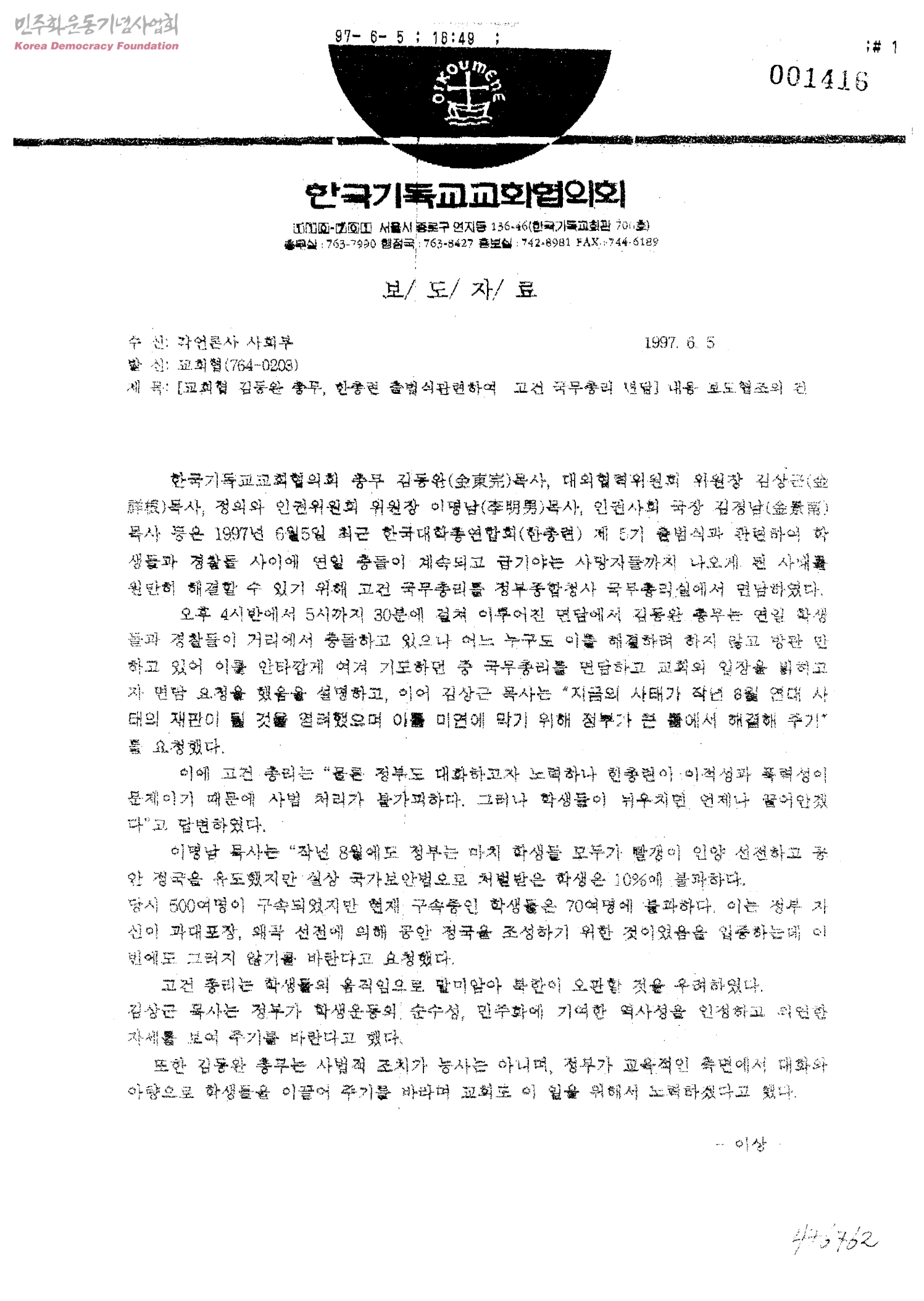보도자료-[교회협 김동완 총무, 한총련 출범식관련하여 고건 국무총리 면담]내용 보도협조의 건[수신:각언론사 사회부, 발신:교회협]