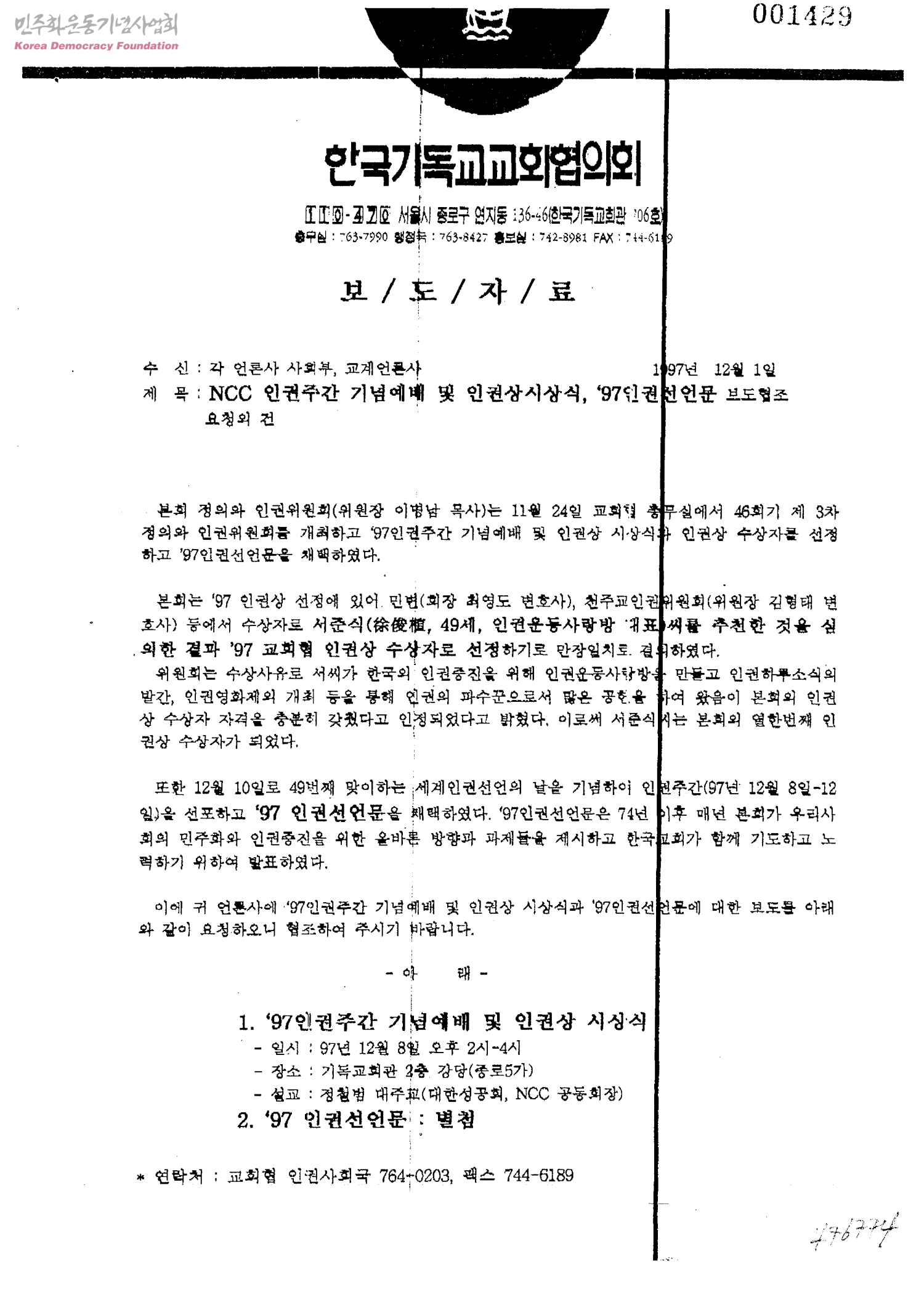 보도자료-NCC 인권주간 기념예배 및 인권상시상식, '97인권선언문 보도협조 요청의 건[수신:각 언론사 사회부, 교계언론사]