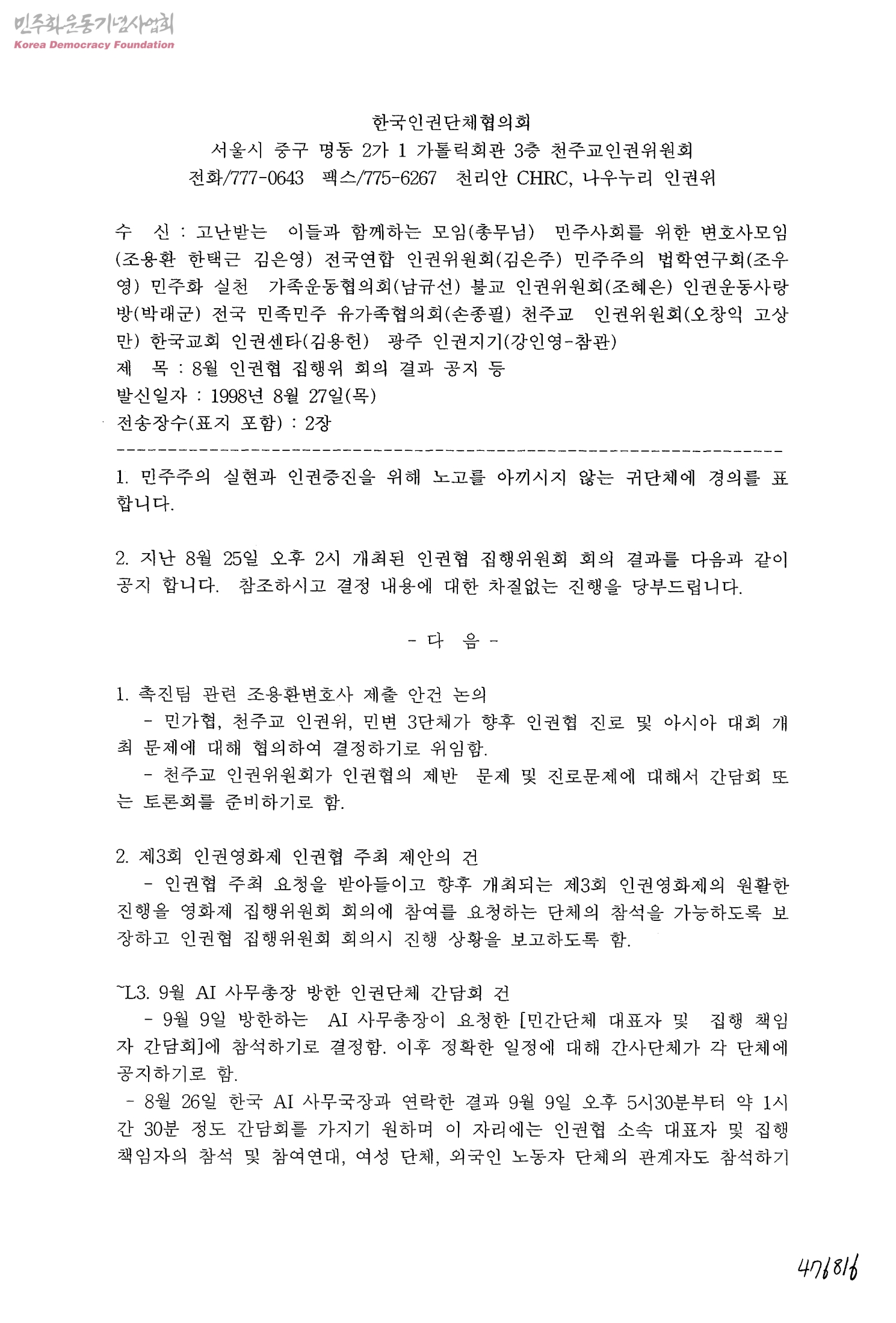 8월 인권협 집행위 회의 결과 공지 등[[수신:고난받는이들과함께하는모임,민주사회를위한변호사모임,전국연합인권위원회,민주주의법학연구회,민주화실천가족운동협의회,불교인권위원회,인권운동사랑방,전국민족민주유가족협의회,천주교인권위원회,한국교회인권센타,광주인권지기]