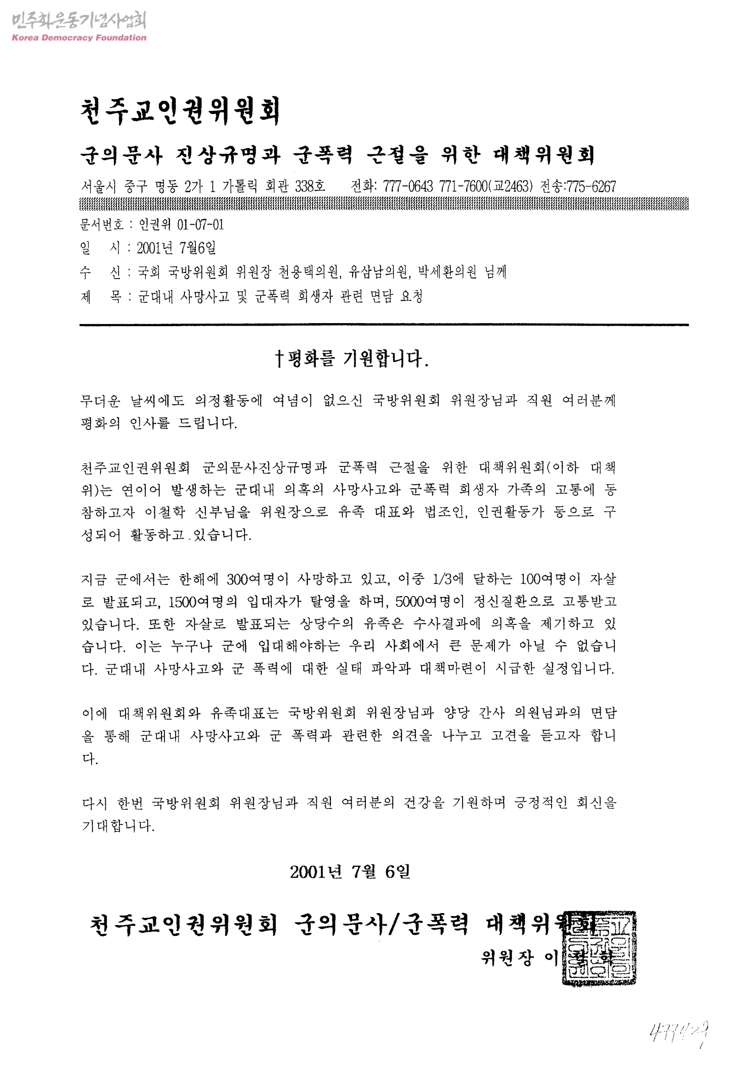 군대내 사망사고 및 군폭력 희생자 관련 면담 요청[수신:국회 국방위원회 위원장 천용택의원, 유삼남의원, 박세환의원 님께]