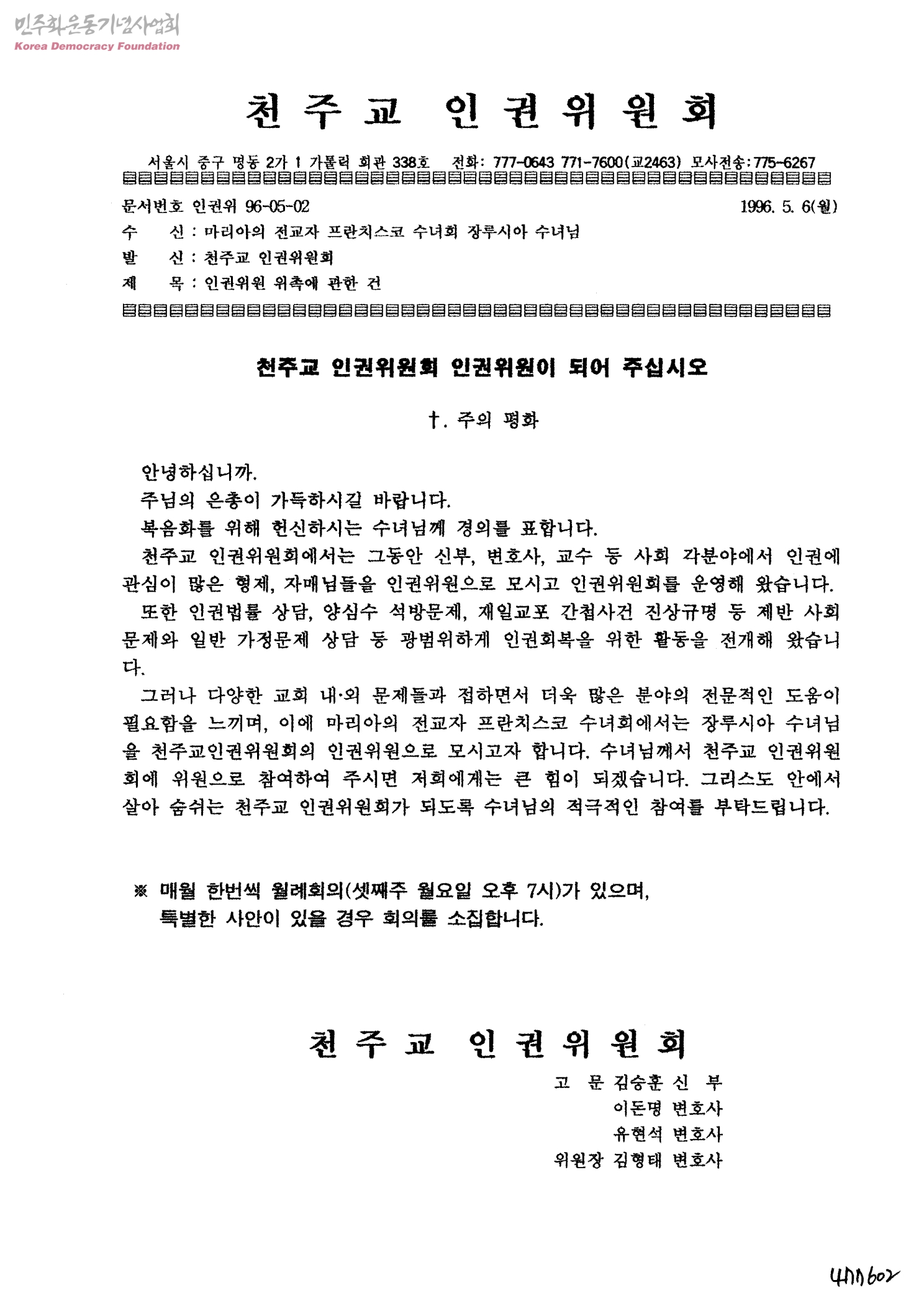 인권위원 위촉에 관한 건[수신:마리아의 전교자 프란치스코 수녀회 장루시아 수녀님, 발신:천주교 인권위원회]