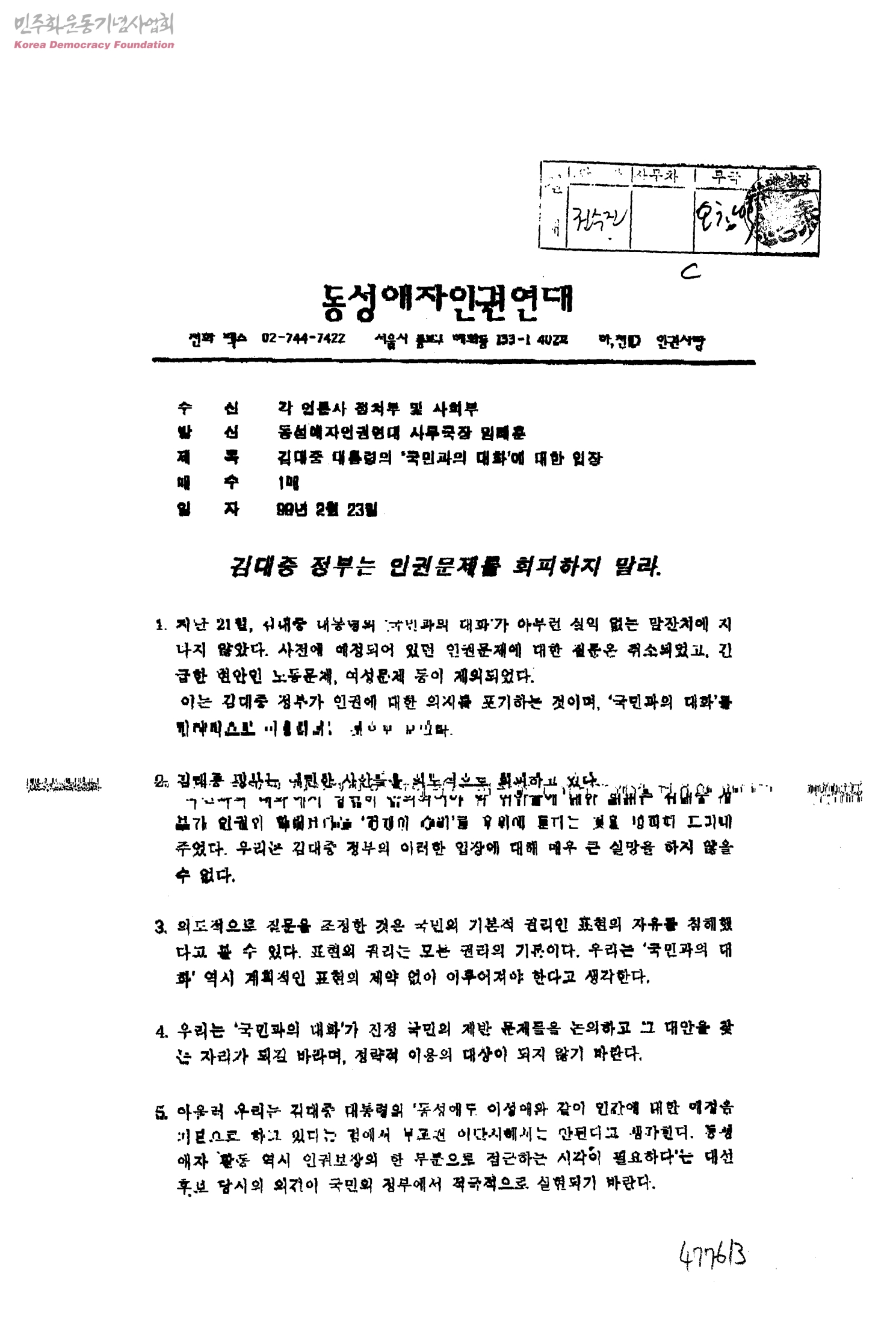 김대중대통령의'국민과의대화'에 대한 입장[수신:각 언론사 정치부 및 사회부 발신:동성애자인권연대 사무국장 임태훈]