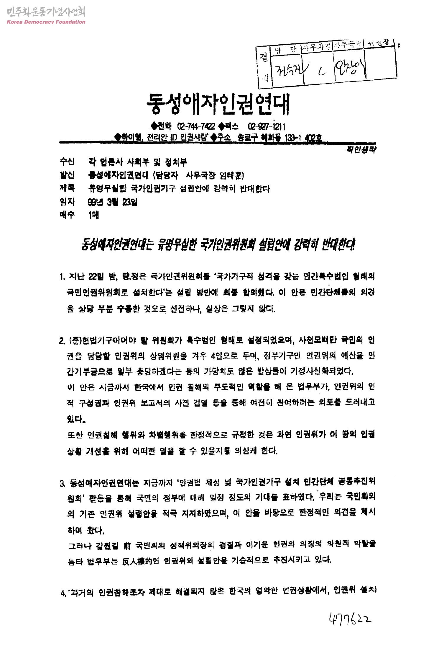 유명무실한 국가인권기구 설립안에 강력히 반대한다[수신:각 언론사 사회부 및 정치부 발신:동성애자인권연대(담당자 사무국장 임태훈)]