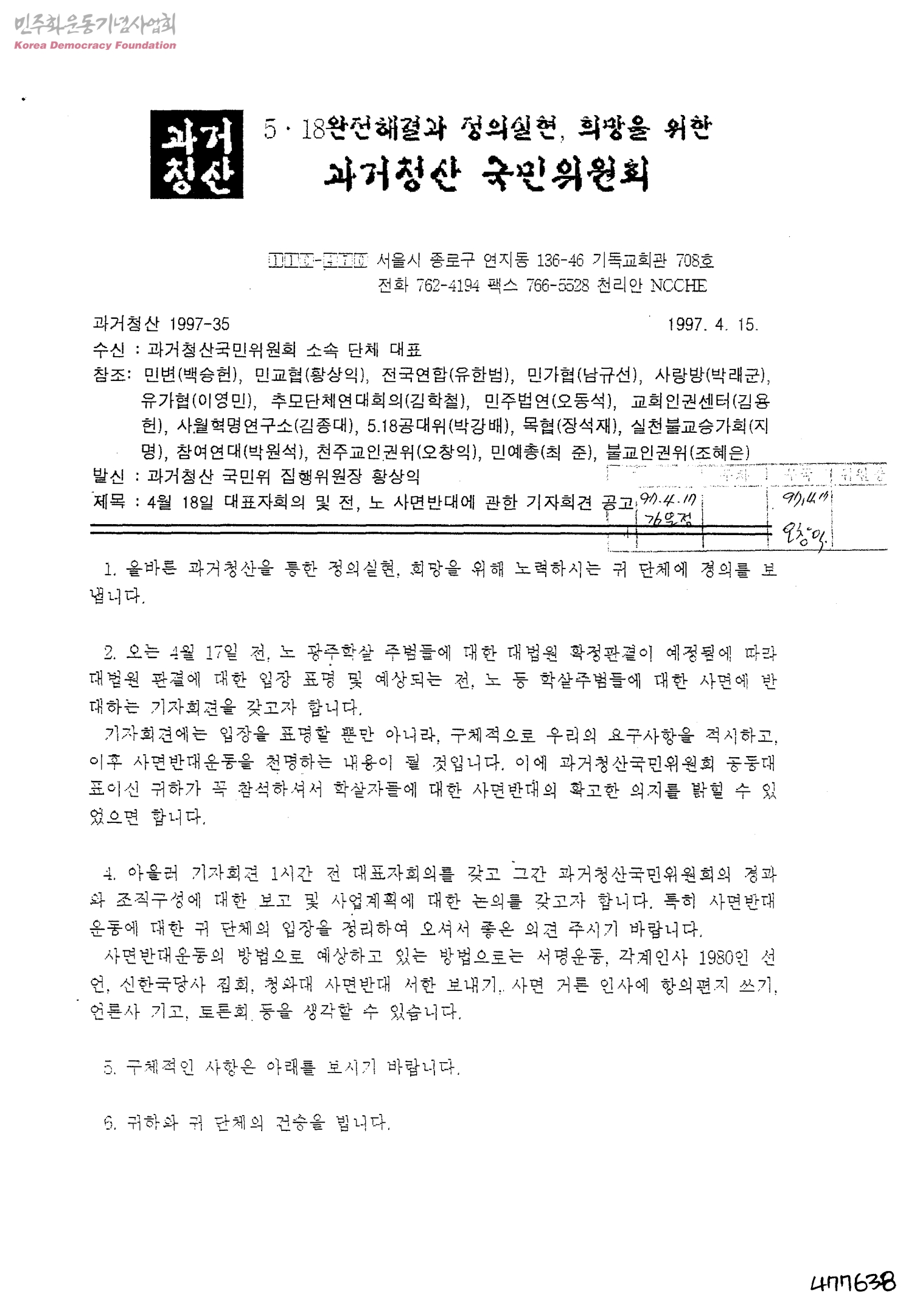 4월 18일 대표자회의 및 전, 노 사면반대에 관한 기자회견 공고[수신:과거청산국민위원회 소속 단체 대표, 발신:과거청산 국민위 집행위원장 황상익]